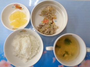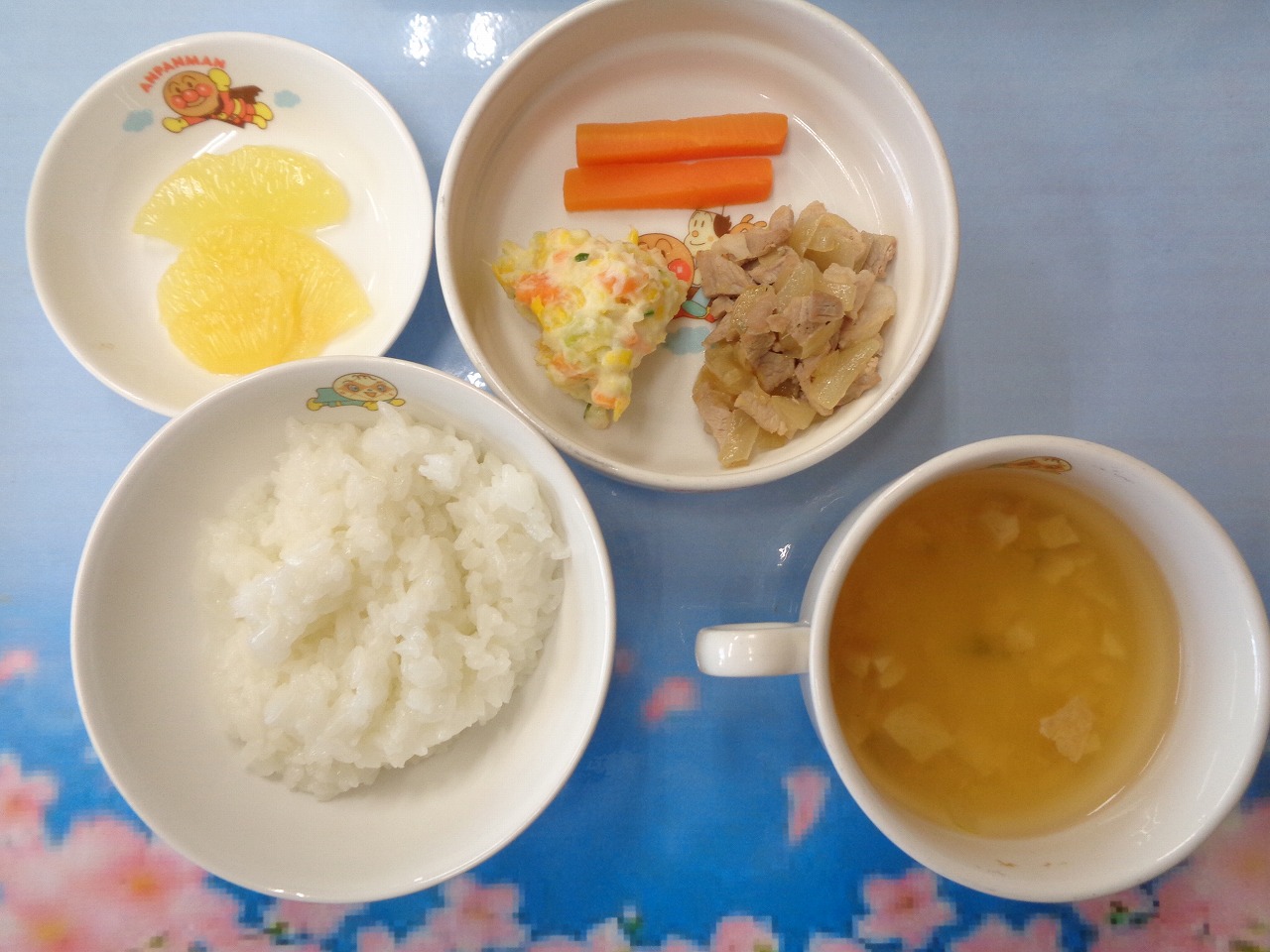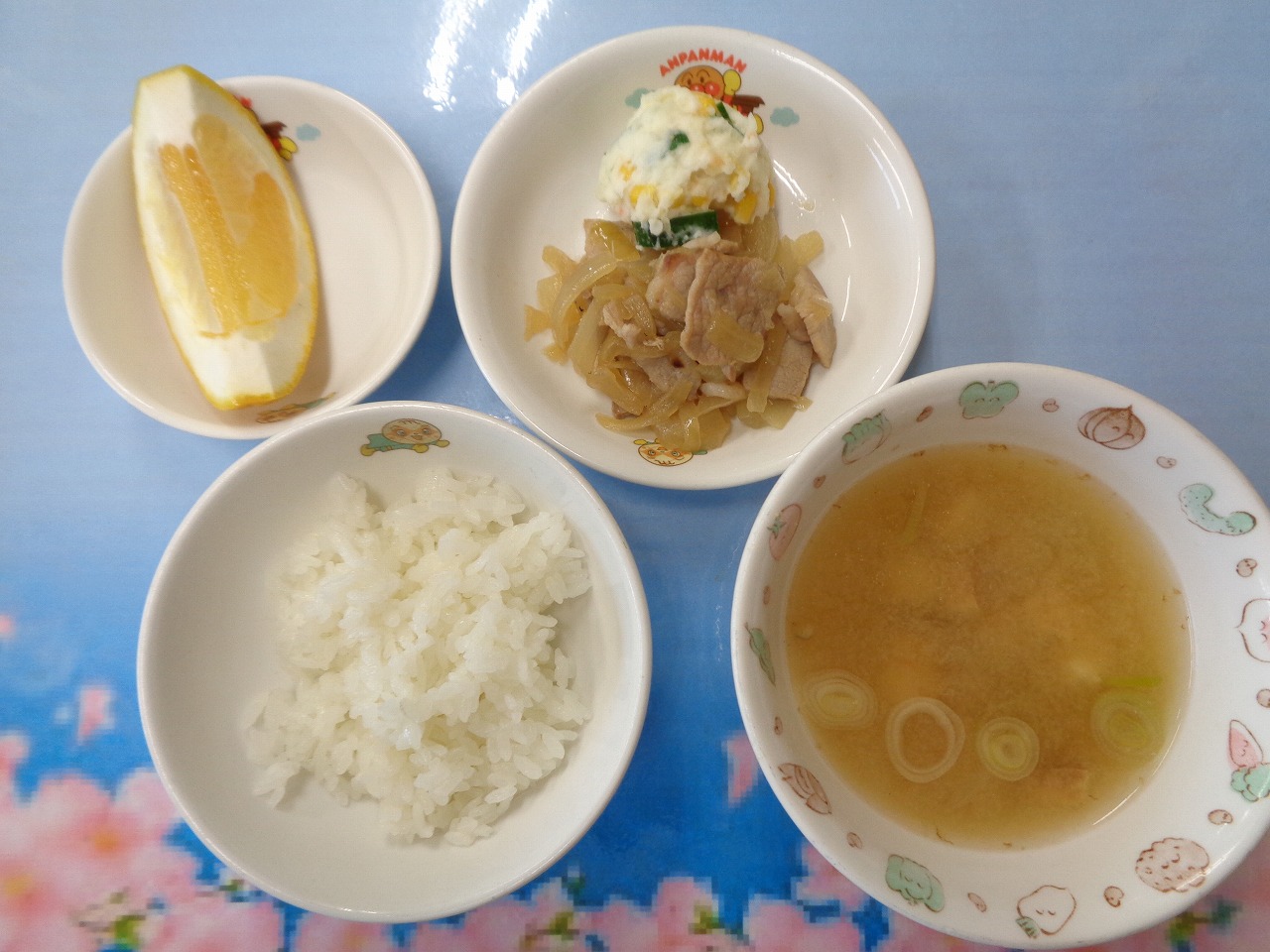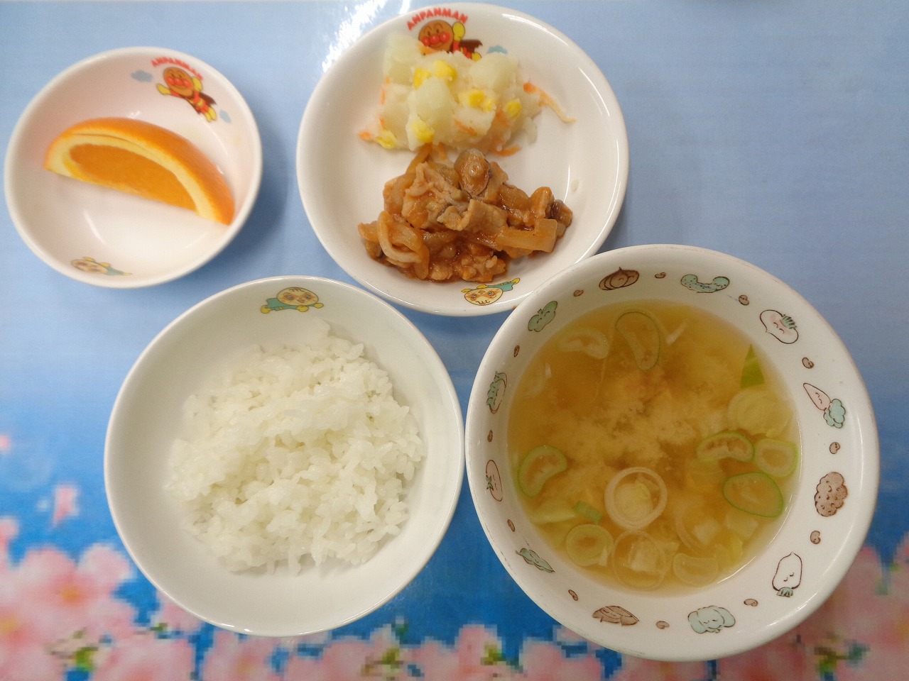 22日の給食は『豚のしょうが炒め・ポテトサラダ・みそ汁(もやし・厚揚げ・葱)・ジューシーフルーツ』で、おやつは『ホットケーキ・牛乳』でした🐷