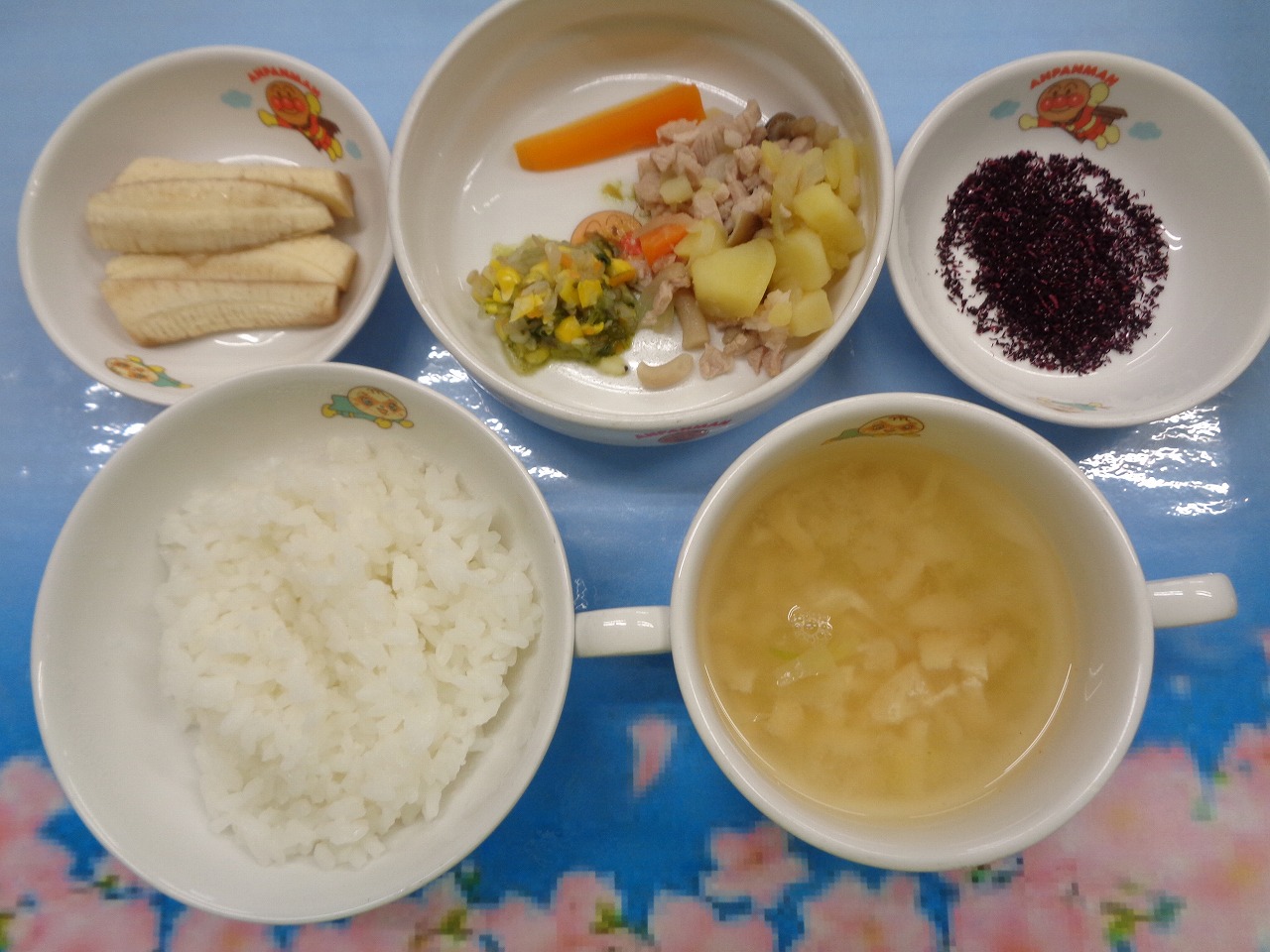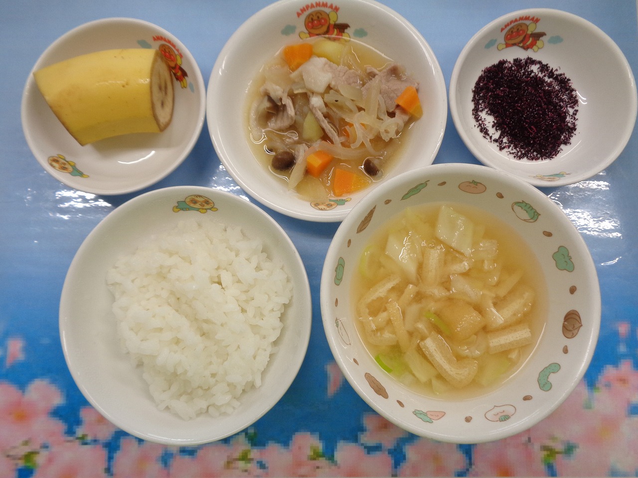 1日の給食は『肉じゃが・お浸し・ゆかり・みそ汁(薄揚げ・キャベツ・葱)・バナナ』でした🍌