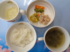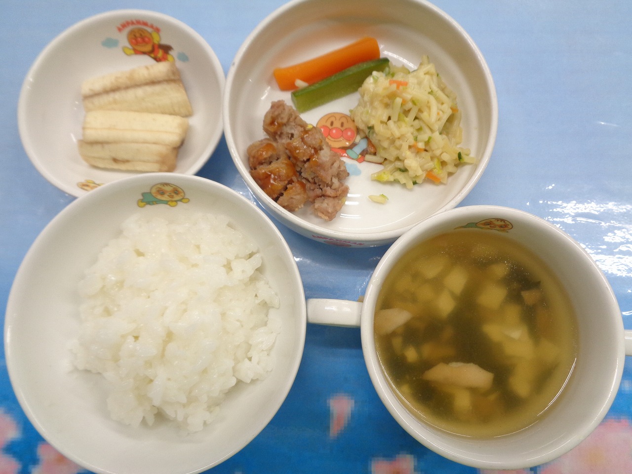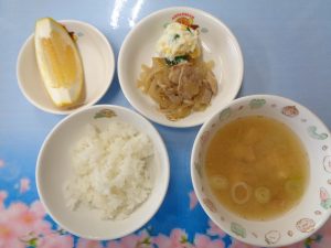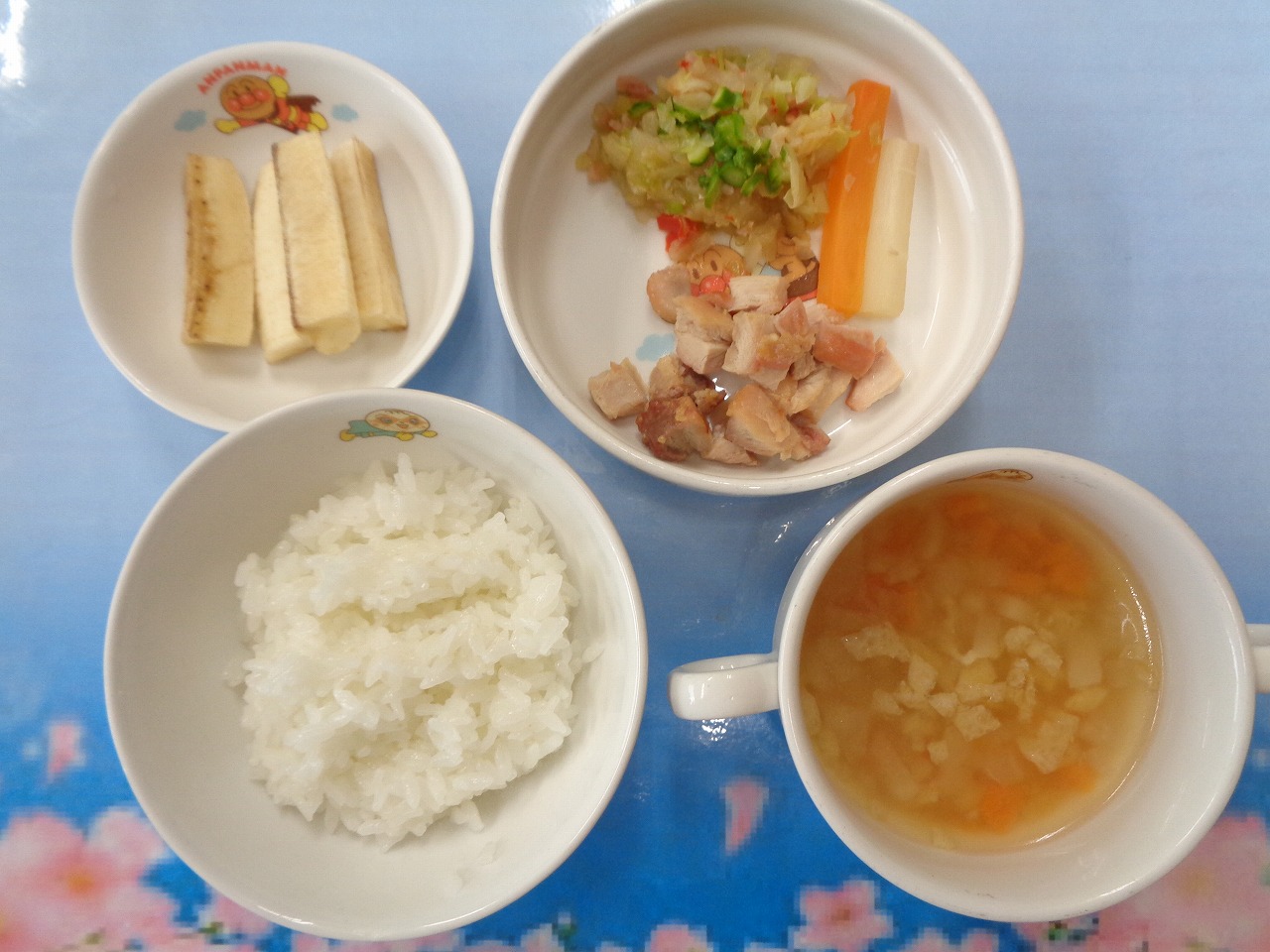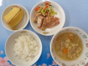 21日の給食は『ごはん・鶏肉の香味焼き・春野菜ソテー・根菜汁・バナナ』でした🍌