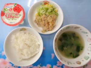 2日の給食は『鶏のパン粉焼き・コールスロー・みそ汁(ほうれん草・えのき)・ゼリー』でした🐔