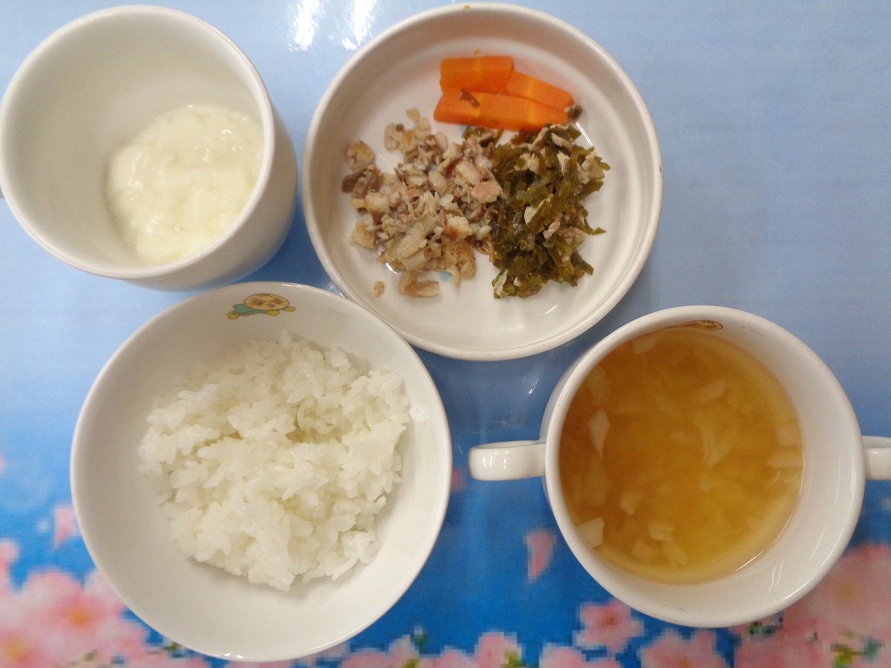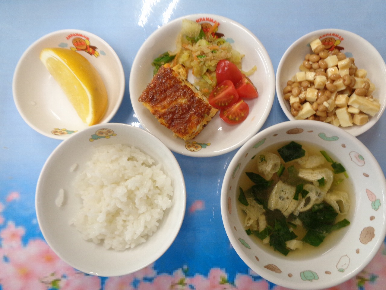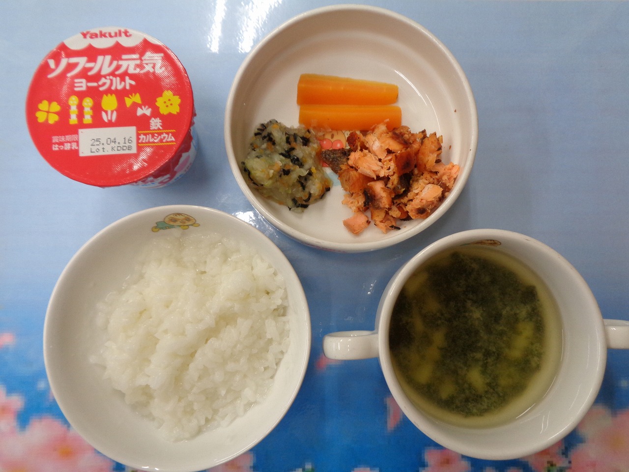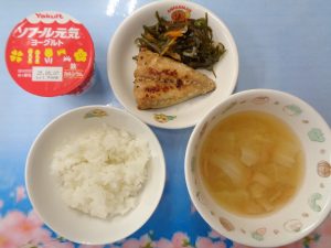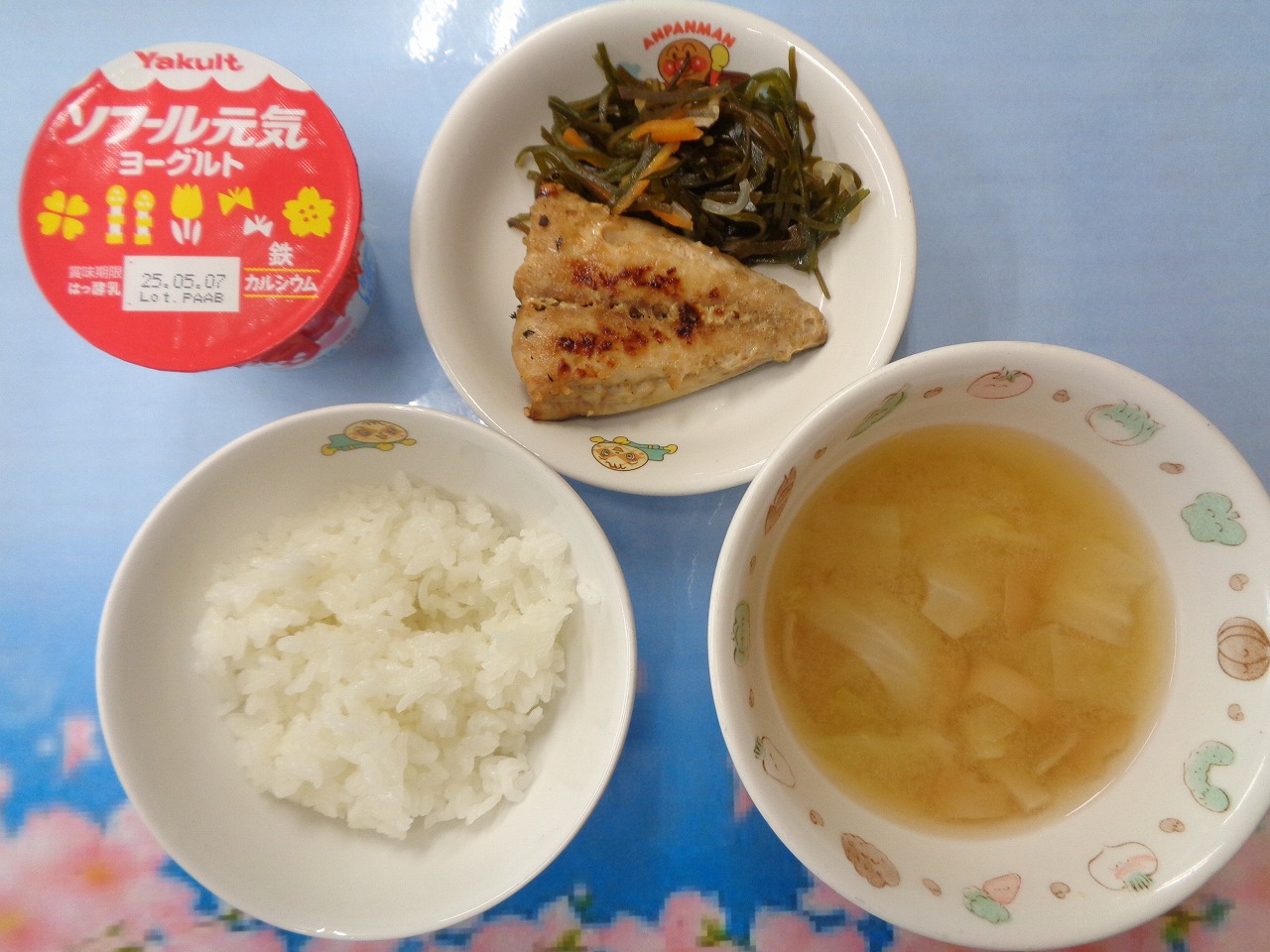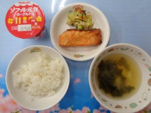 3日の給食は『鮭のムニエル・磯香和え・みそ汁(わかめ・じゃが芋)・ヨーグルト』でした🐟