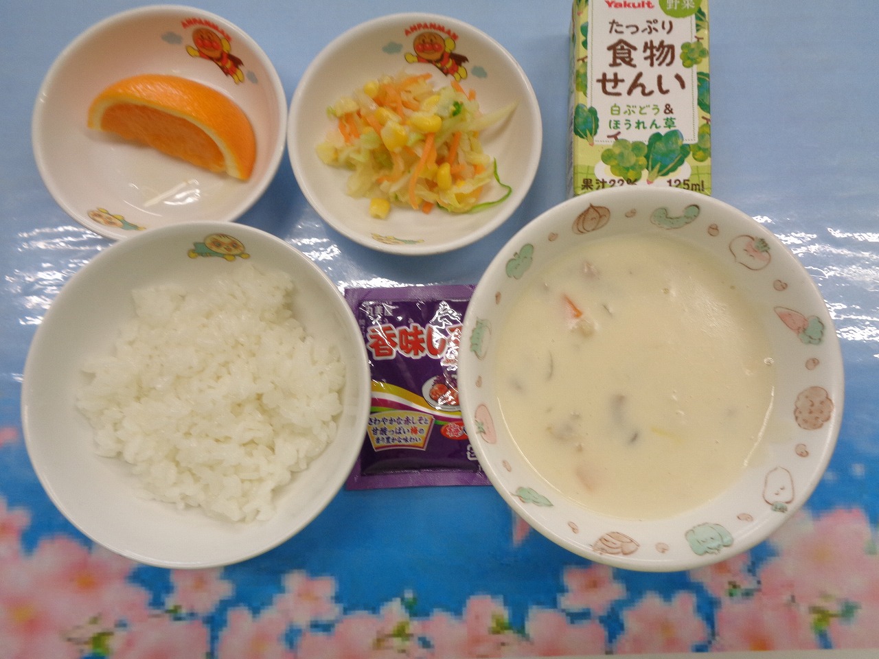 4日の給食は『クリームシチュー・三食サラダ・ふりかけ・野菜ジュース・オレンジ』🍊