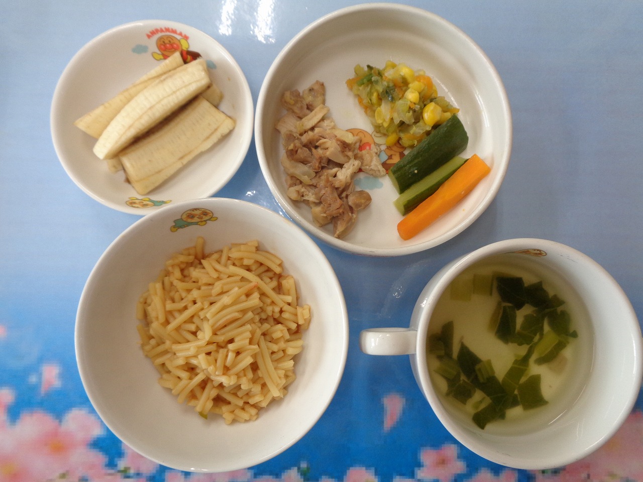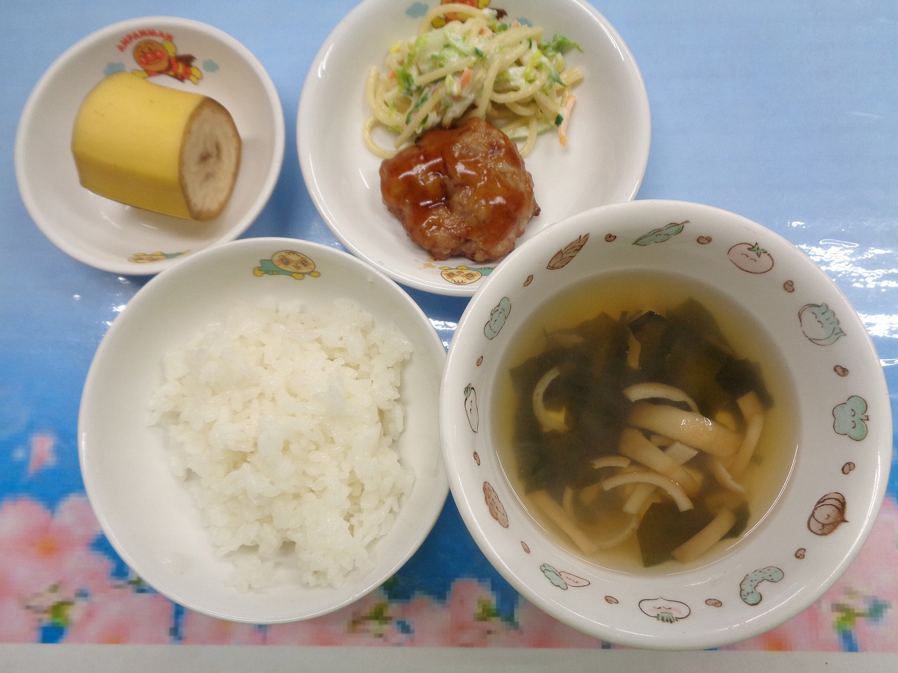 18日の給食は『照り焼きハンバーグ・パスタサラダ・すまし汁(豆腐・焼き麩・わかめ)・バナナ』でした🍌