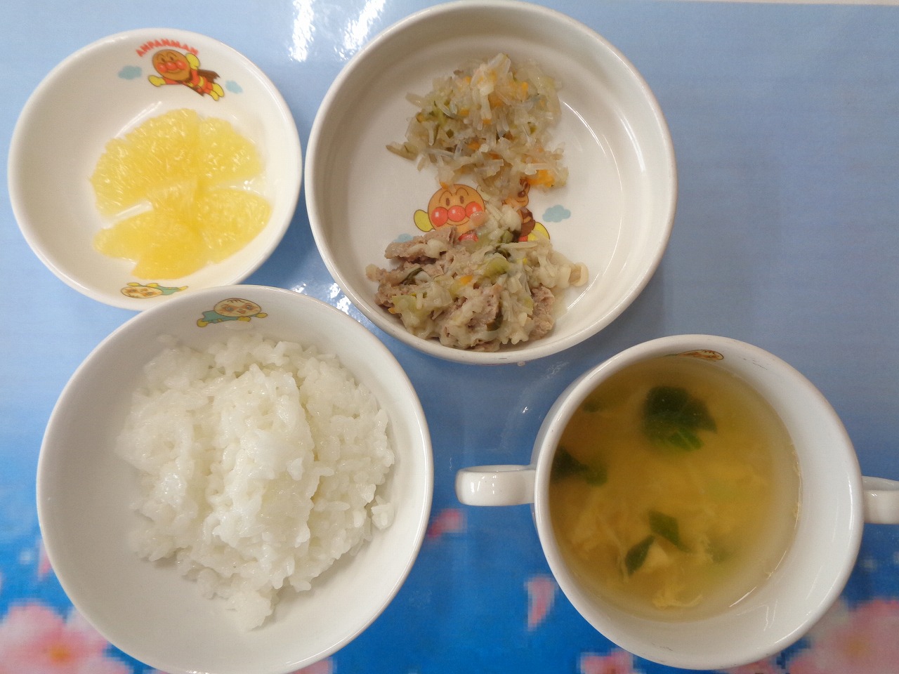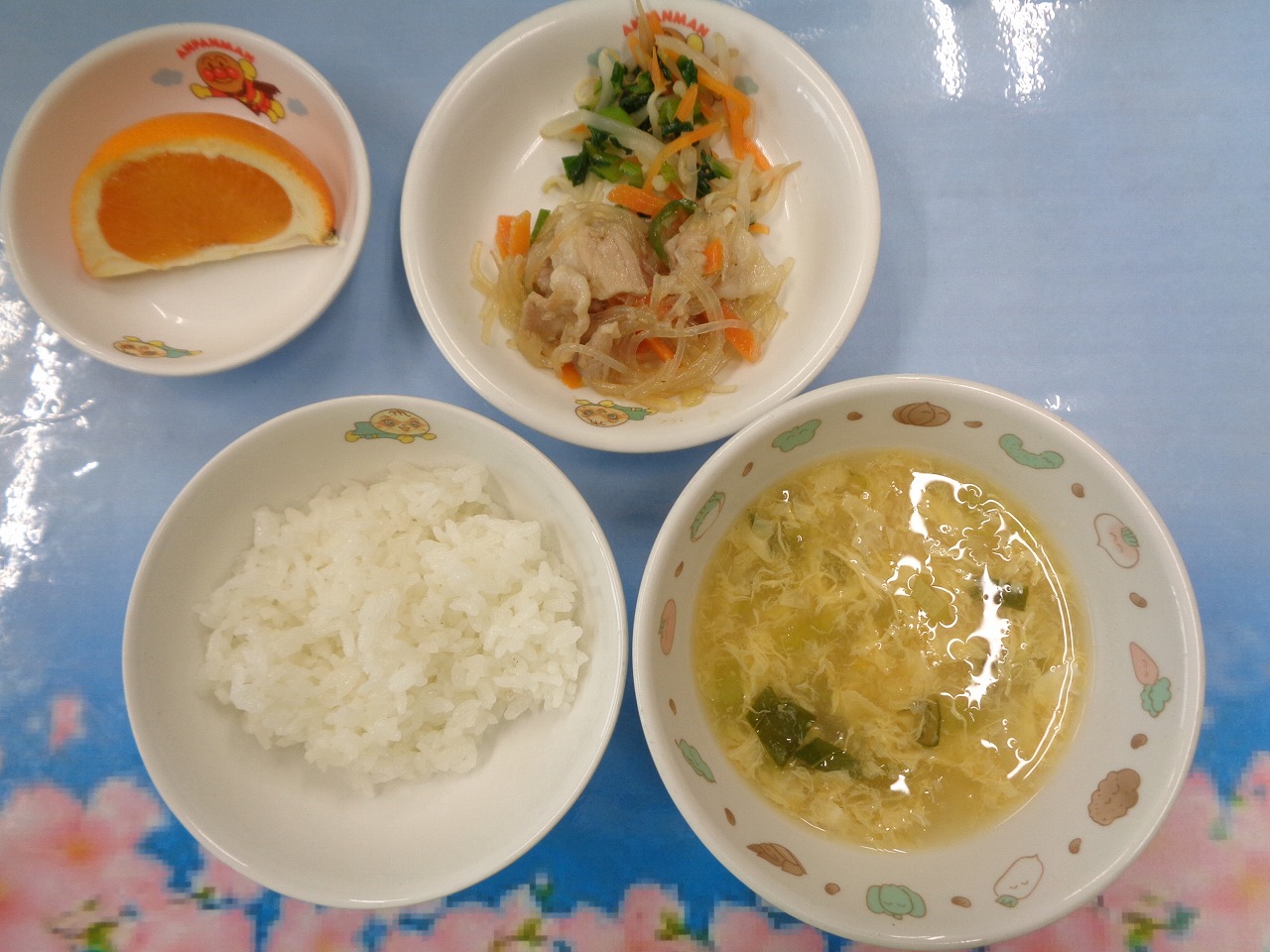 14日の給食は『プルコギ風・もやしのナムル・スーミータン・清見オレンジ』でした🍊