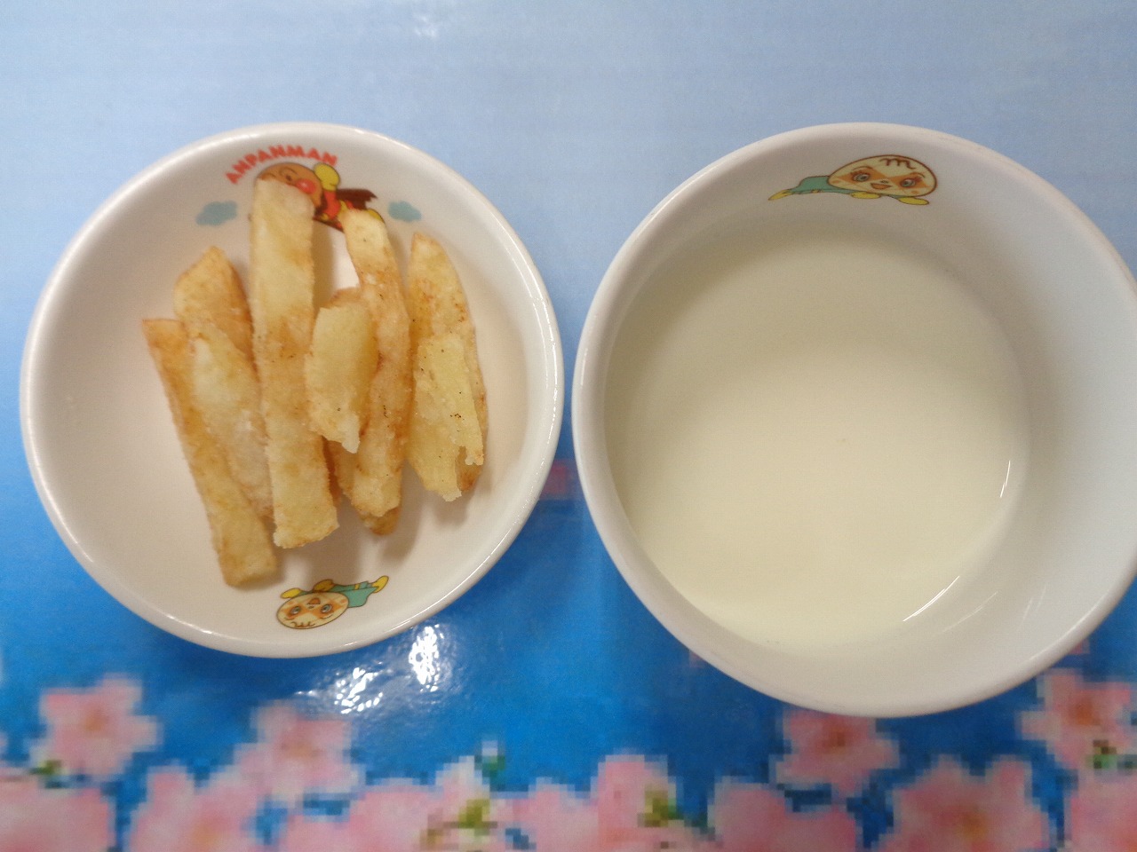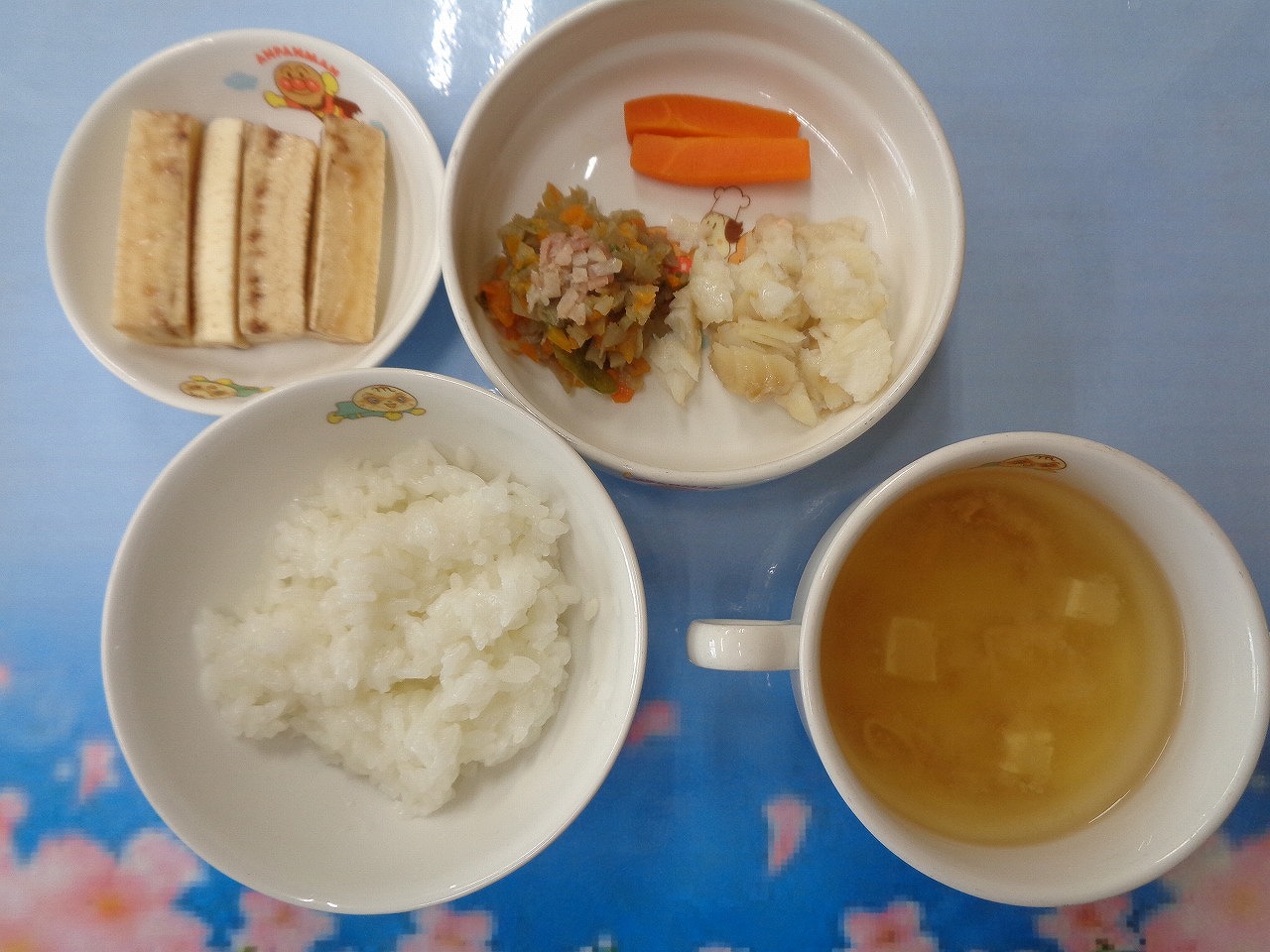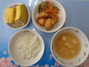 9日の給食は『白身魚フライ・洋風きんぴら・みそ汁(焼き麩・豆腐)・バナナ』で、おやつは『マドレーヌ・牛乳』でした🍌