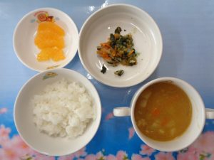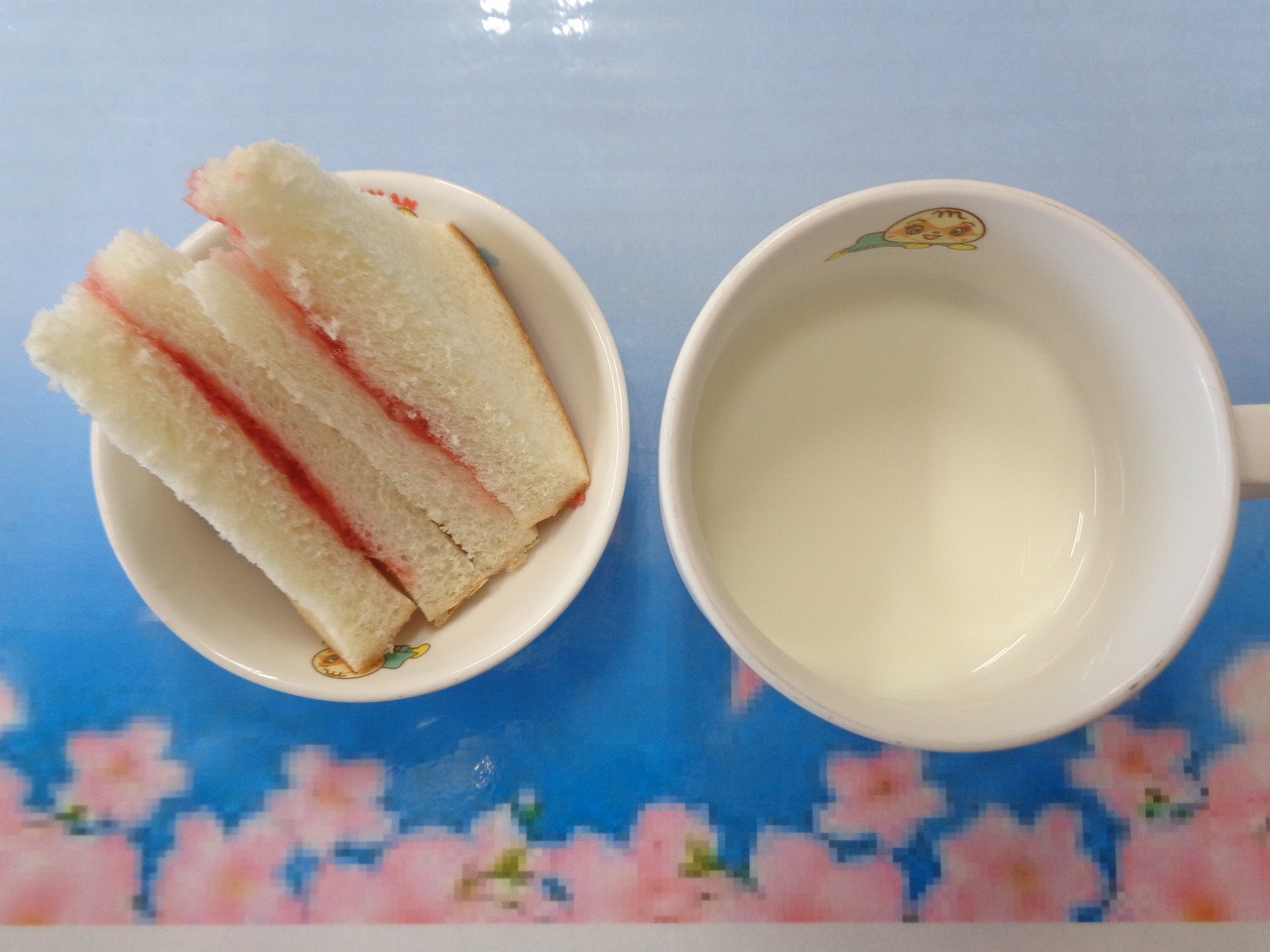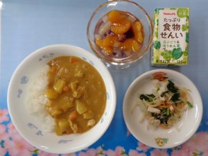 10日の給食は『チキンカレーライス・ほうれん草サラダ・フルーツポンチ・白ブドウジュース』で、おやつは『ジャムサンド・牛乳』でした🍛