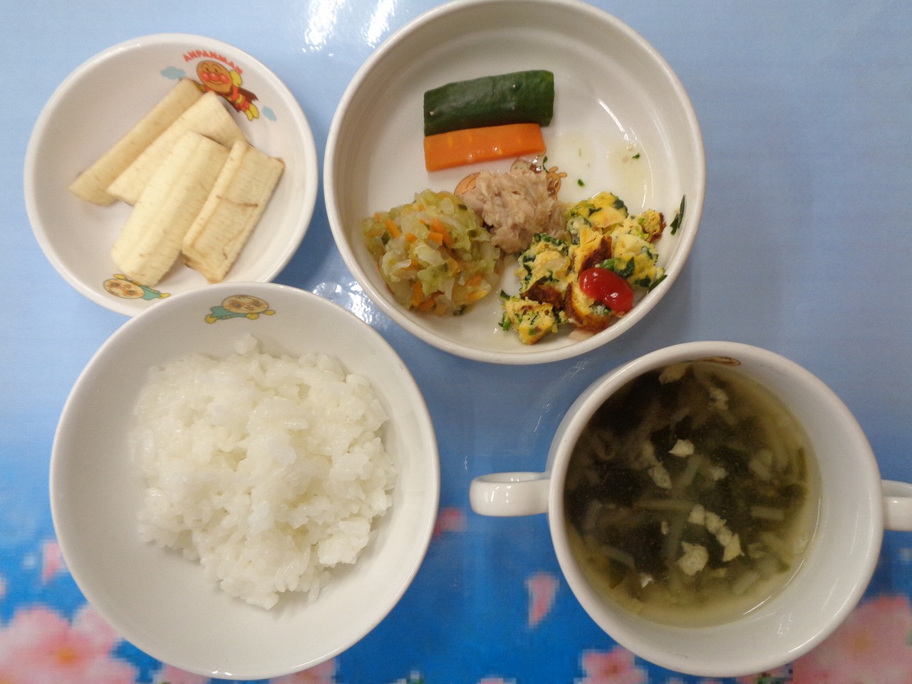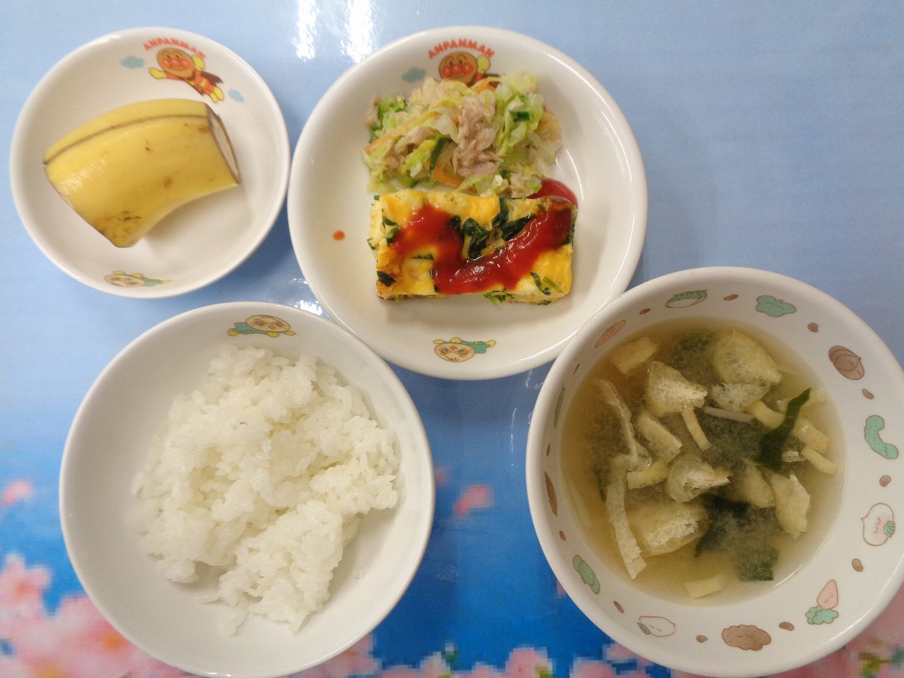 11日の給食は『キッシュ風オムレツ・ツナサラダ・みそ汁(もやし・わかめ・薄揚げ)・バナナ』でした🍌