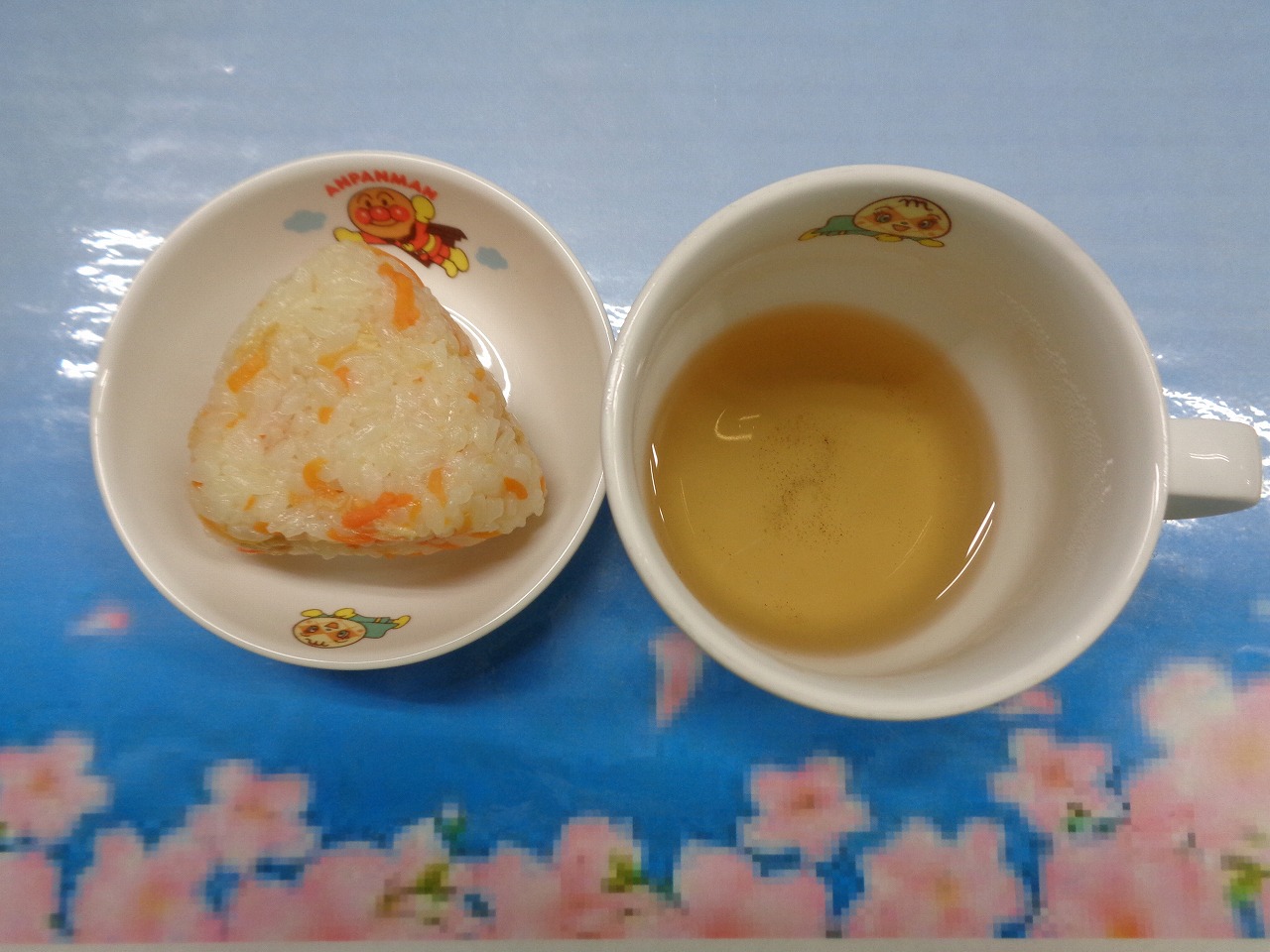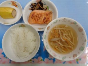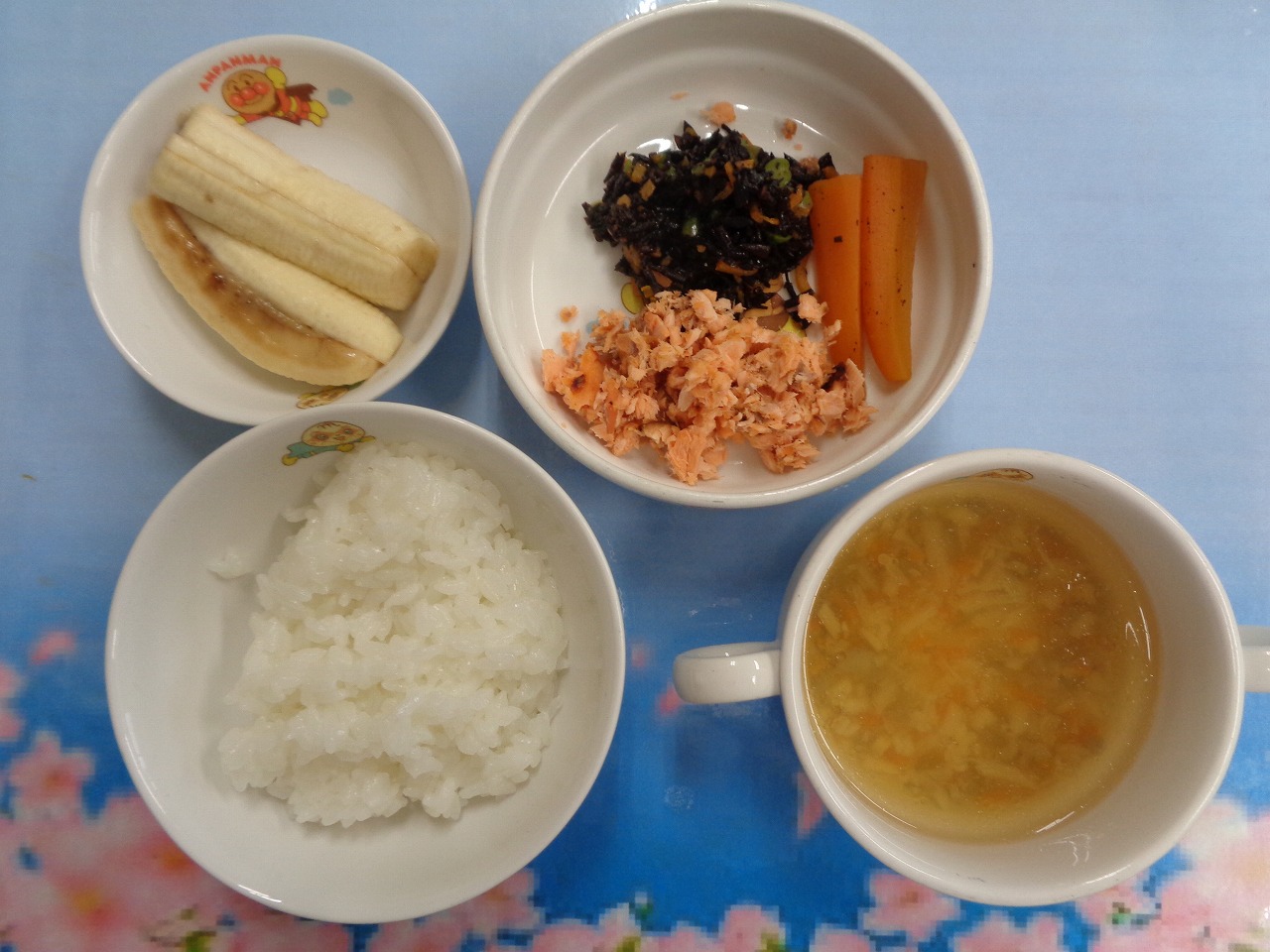15日の給食は『鮭のみそ焼き・ひじきの炒め煮・沢煮椀・バナナ』で、おやつは『きつねおにぎり・麦茶』でした🐟