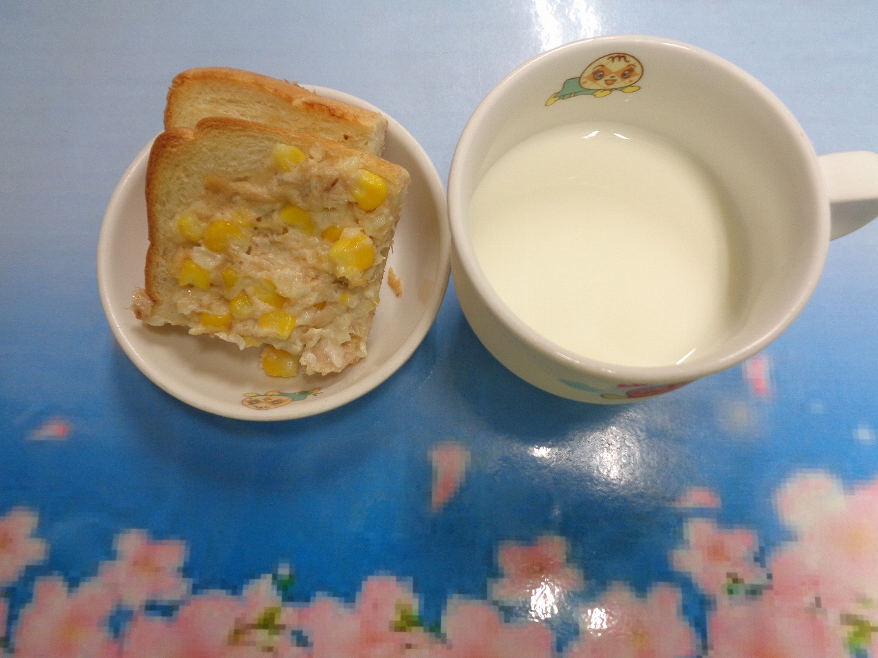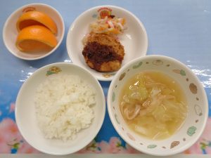 17日の給食は『コロッケ・しょうゆフレンチ・みそ汁(キャベツ・焼き麩)・ふりかけ・オレンジ』で、おやつは『ツナトースト・牛乳』でした🍊