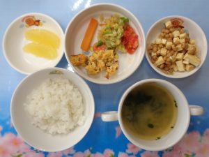 23日の給食は『五目卵焼き・ごま和え・チーズ納豆・みそ汁・ジューシーフルーツ・トマト』で、おやつは『フライドポテト・牛乳』でした🍟今日の給食のトマトは保護者の方からいただきましたグッド (上向き矢印)うまい! (顔)とてもおいしいトマトでした🍅ごちそうさまでしたハートたち (複数ハート)明日のおやつにもいただいたトマトでピザトーストを作るよるんるん (音符)