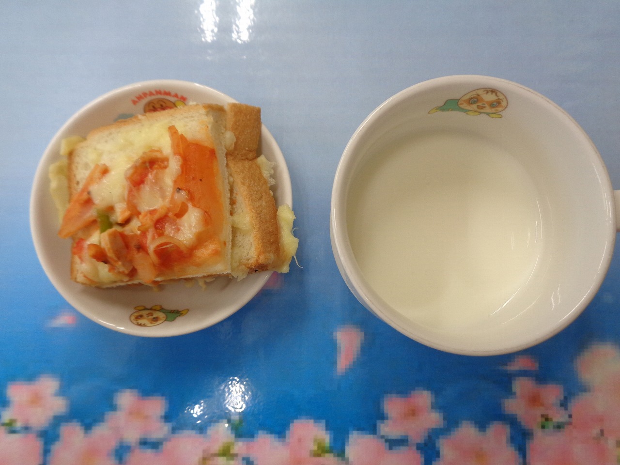 24日の給食は『ポークチャップ・コーンポテト・みそ汁(きゃべつ・厚揚げ・葱)・オレンジ』で、おやつは『ピザトースト・牛乳』でした🍅🍅🍅