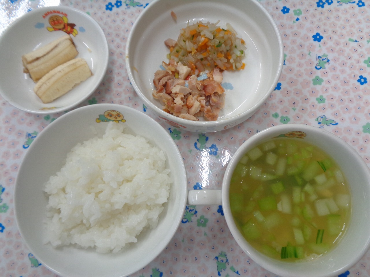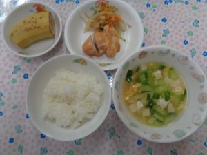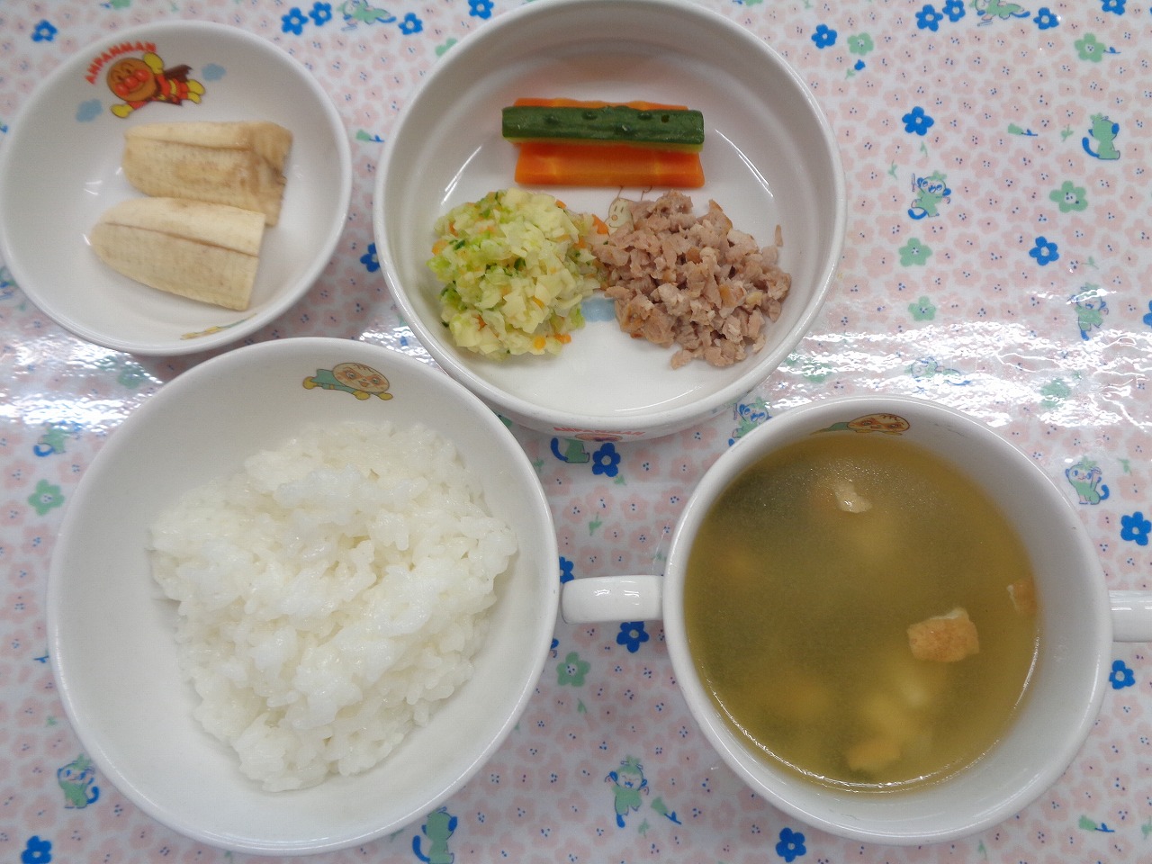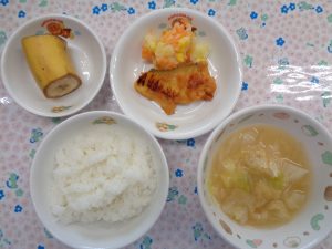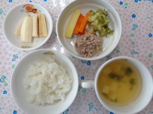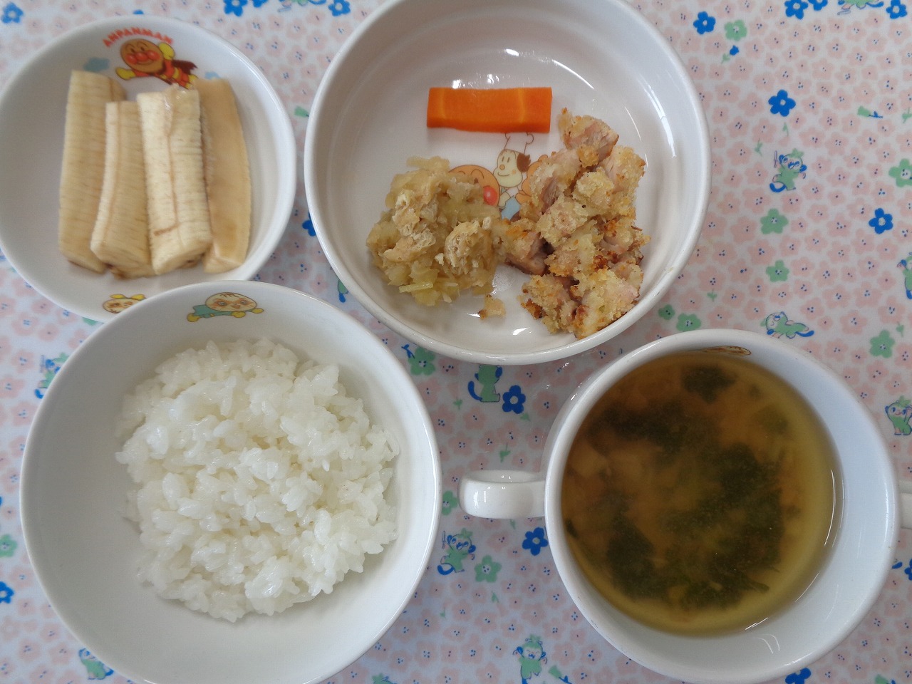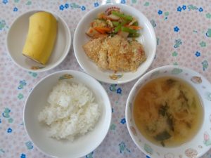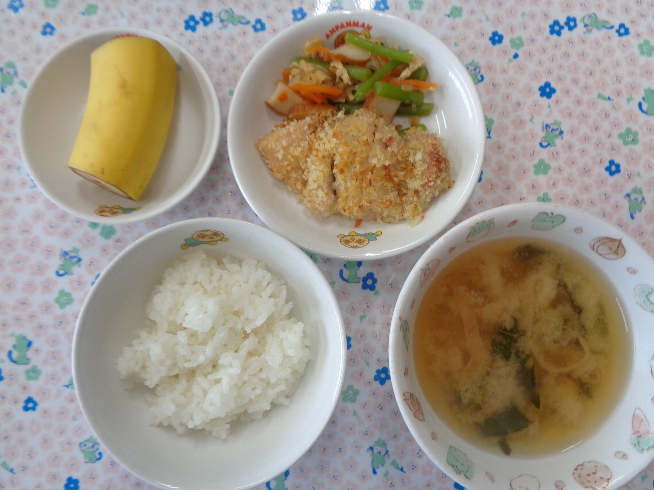 23日の給食は『鶏肉のパン粉焼き・みずの炒り煮・みそ汁(小松菜・えのき・焼き麩)・バナナ』でした晴れ