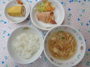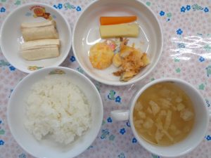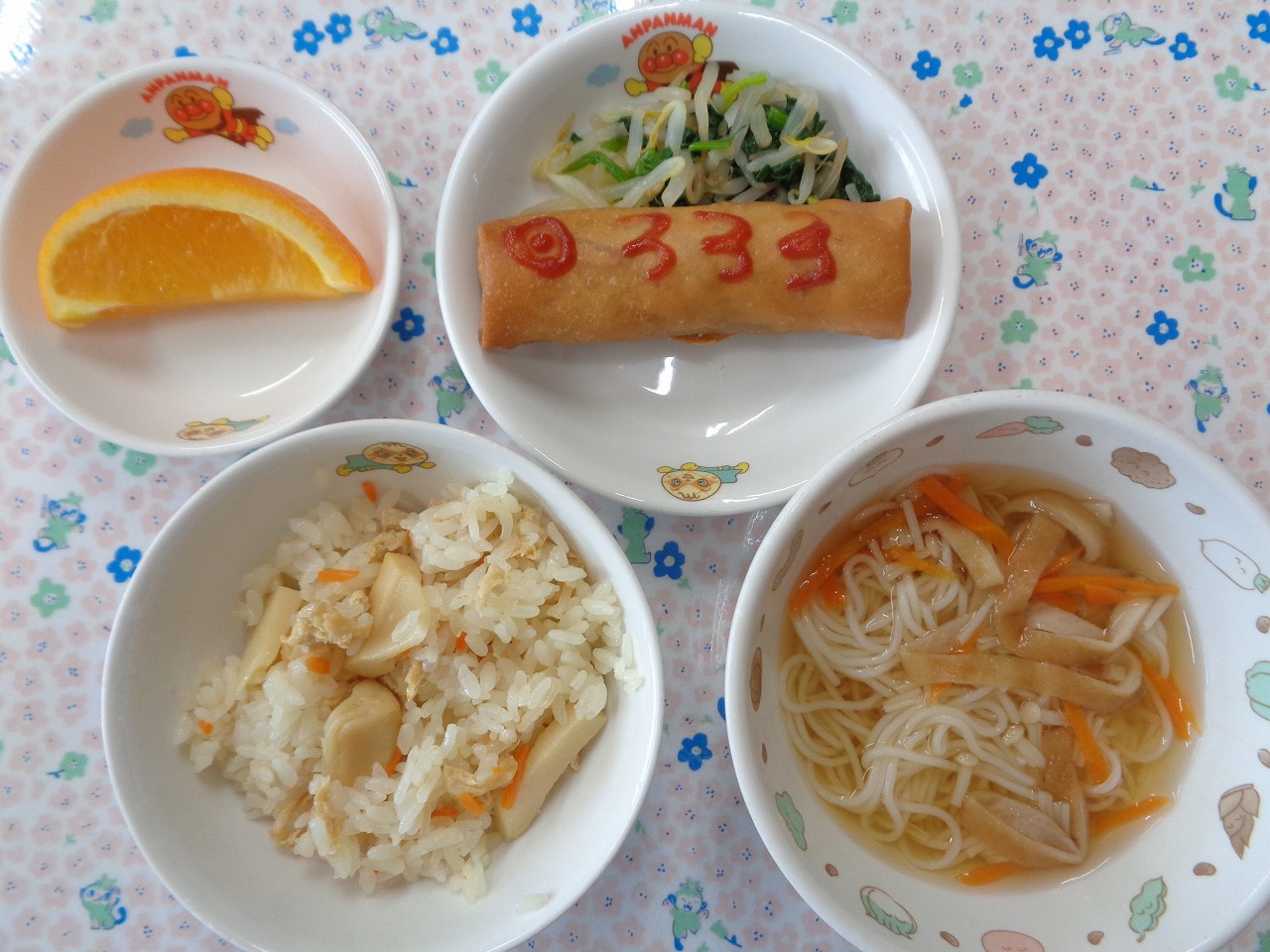 2日の給食は『たけのこご飯・春巻き・お浸し・ふきながし汁・オレンジ』でした。子ども達が食べている様子もアップしたので、そちらもぜひご覧くださいるんるん (音符)