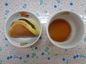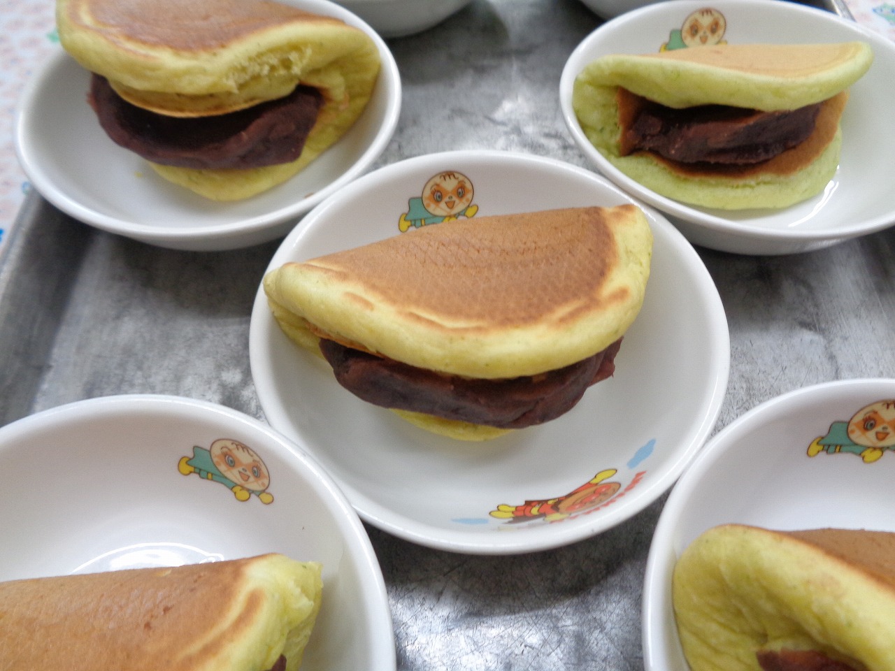 おやつは『よもぎ入りどら焼き・麦茶』でした。どら焼きは柏餅をイメージして作ってみましたよぴかぴか (新しい)ウッシッシ (顔)