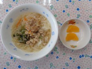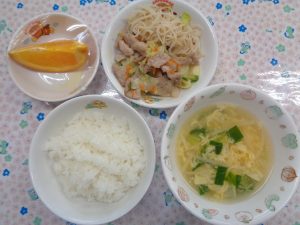 26日の給食は『豚キャベツ塩麹炒め・ビーフンソテー・たけのこスープ・オレンジ』で、