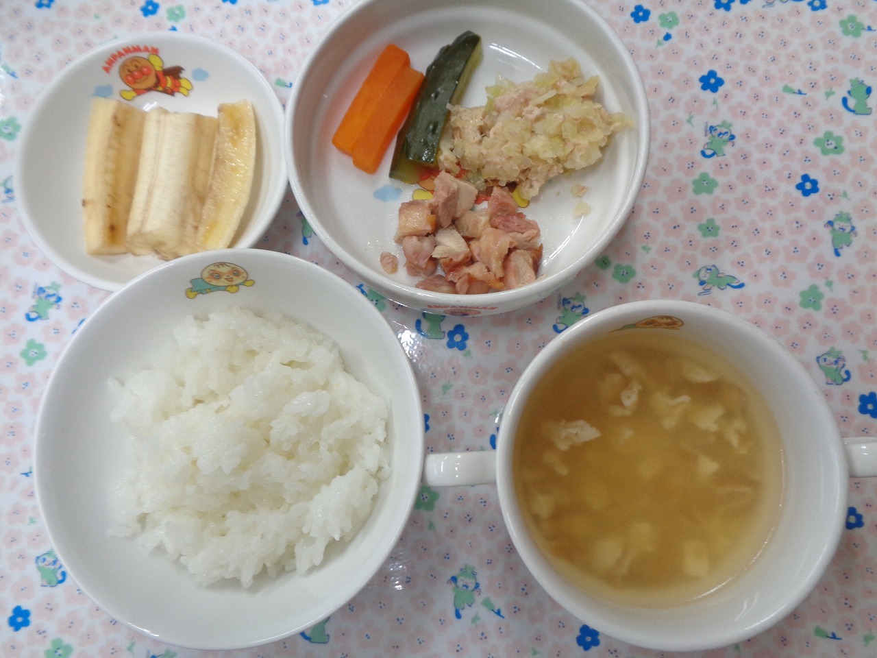 7日の給食は『ガーリックチキン・ツナサラダ・みそ汁(豆腐・焼き麩・葱)・バナナ』で、