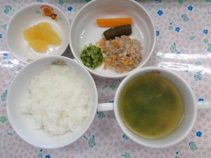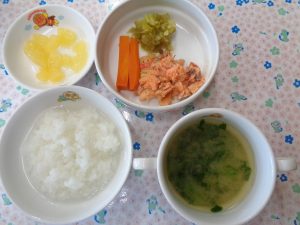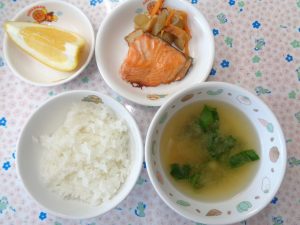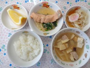 8日の給食は『ご飯・鮭のしょうゆ漬け焼き・ふきの炒り煮・みそ汁(玉葱・ほうれん草)・ジューシーフルーツ』で、