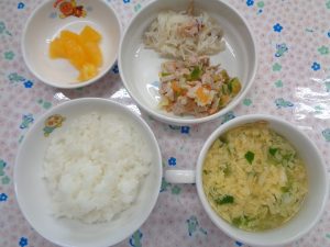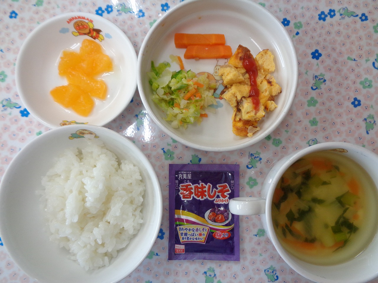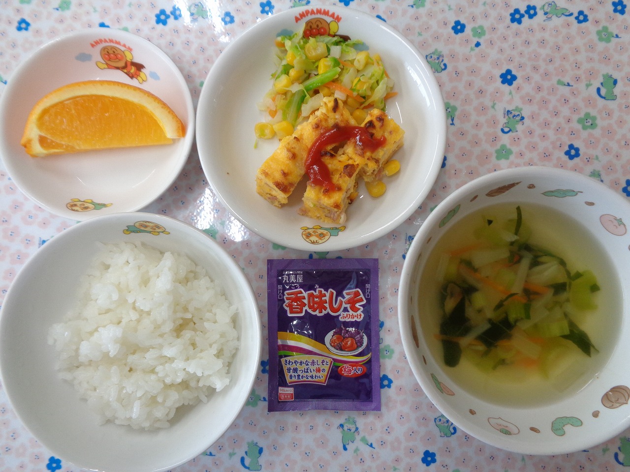 9日の給食は『スパニッシュオムレツ・フレンチサラダ・ふりかけ・コンソメスープ・オレンジ』でした🍳