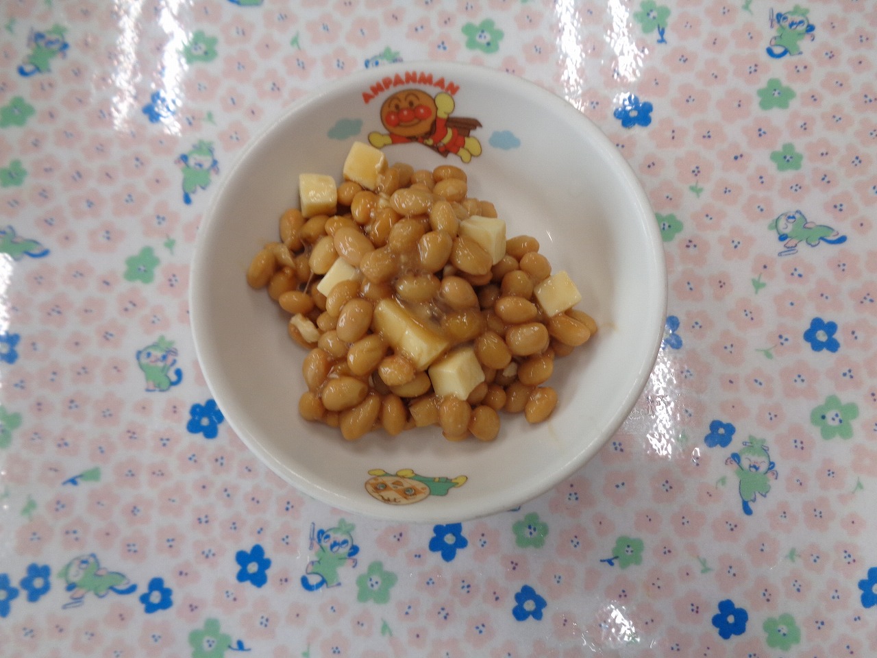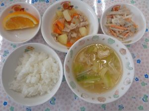 13日の給食は『肉じゃが・ごぼうサラダ・チーズ納豆・みそ汁(きゃべつ・薄揚げ・もやし)・オレンジ』で、