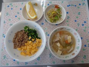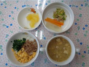 14日の給食は『三食丼・おかか和え・豚汁・ジューシーフルーツ』で、