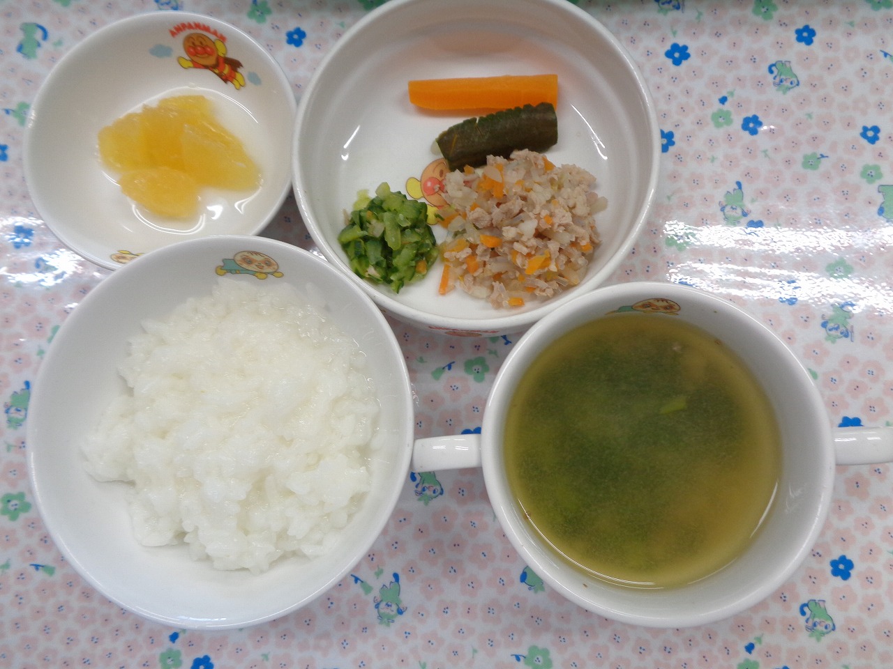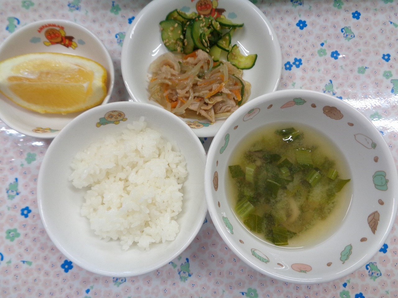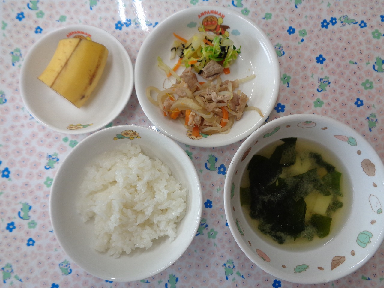 15日の給食は『豚肉とうどの炒め物・磯香和え・みそ汁(じゃがいも・わかめ)・バナナ』で、