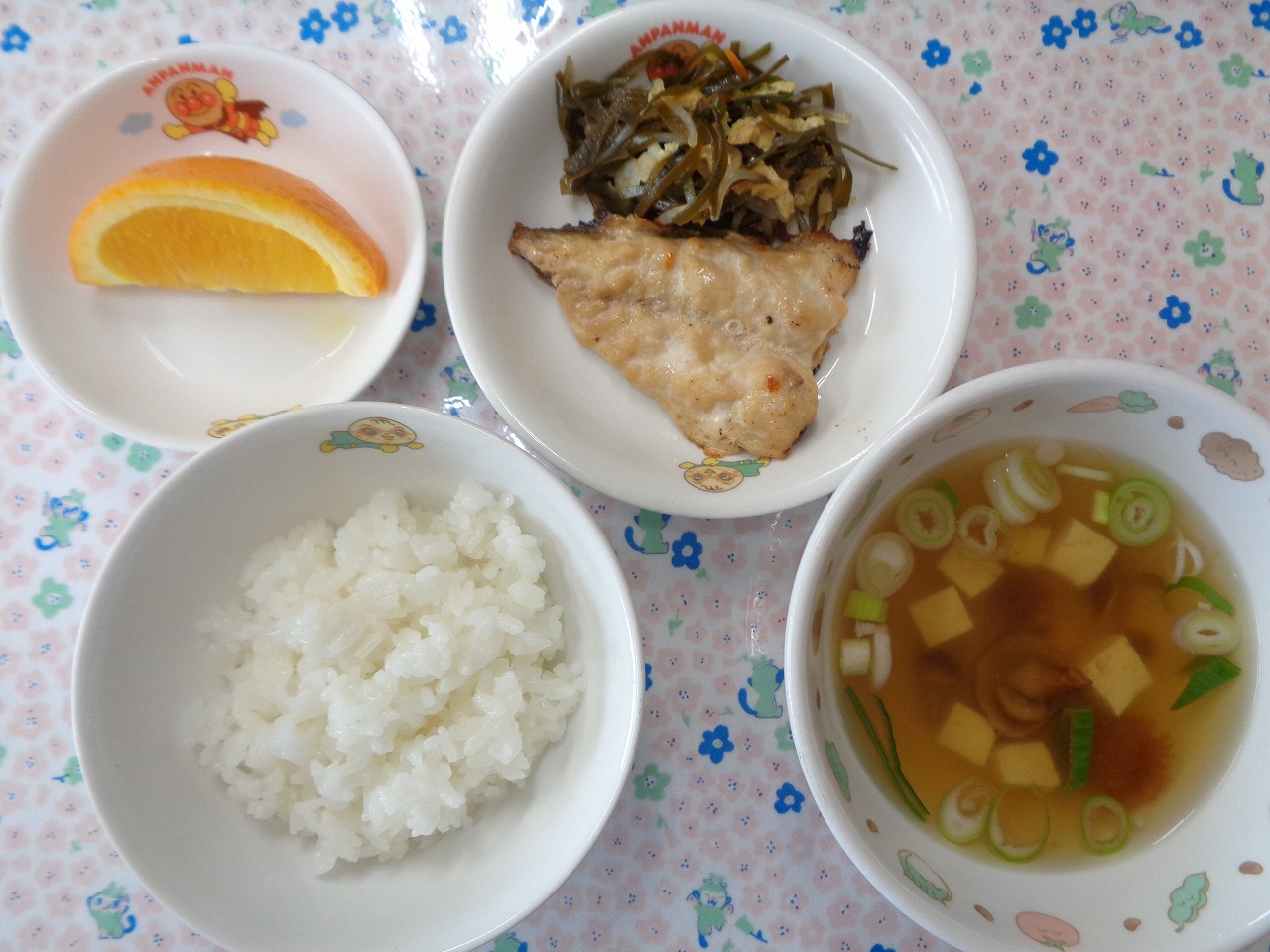 16日の給食は『さばのみそ焼き・すき昆布煮・すまし汁(なめこ・豆腐・葱)・オレンジ』でした目がハート (顔)