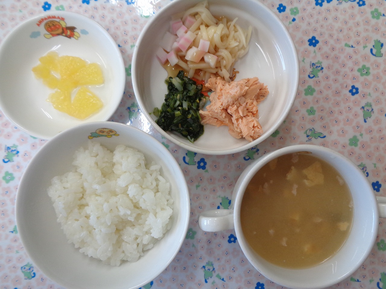 19日の給食は『にらます・あんかけうどん・孟宗汁・ジューシーフルーツ』で、