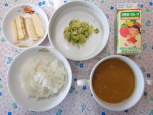 1日の給食は『タンドリーカレイ・コーンポテト・みそ汁(キャベツ・もやし・薄揚げ)・バナナ』で、