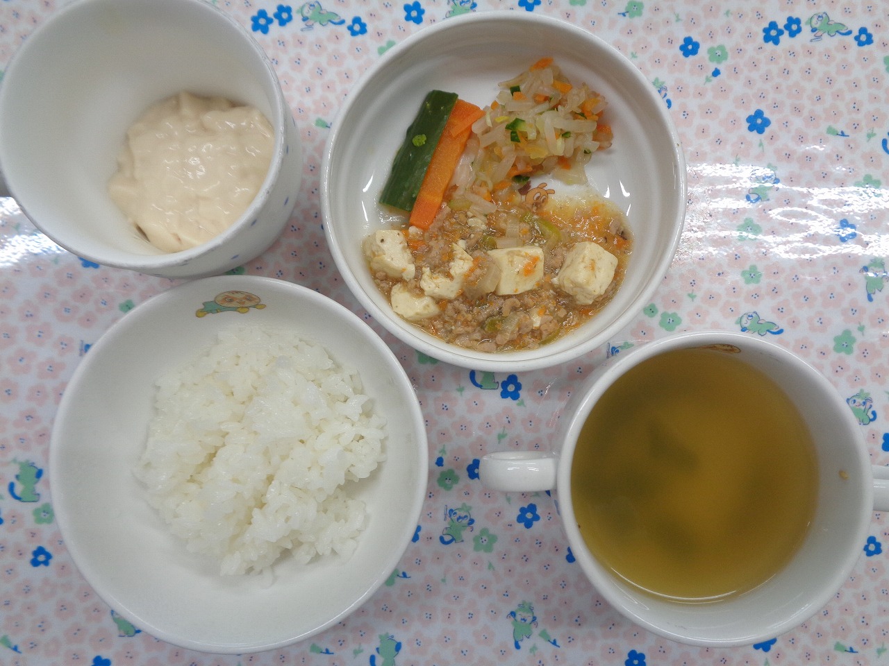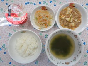 21日の給食は『麻婆豆腐・春雨サラダ・わかめスープ・カップdeヤクルト』で、