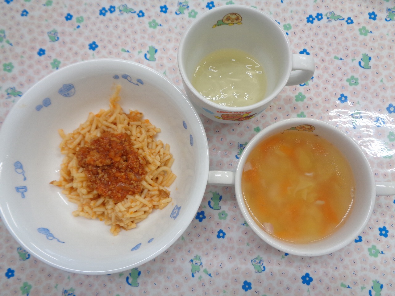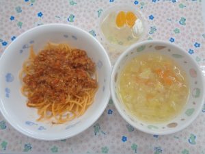 22日の給食は『ミートソーススパゲッティ・野菜スープ・ゼリーアラモード』で、