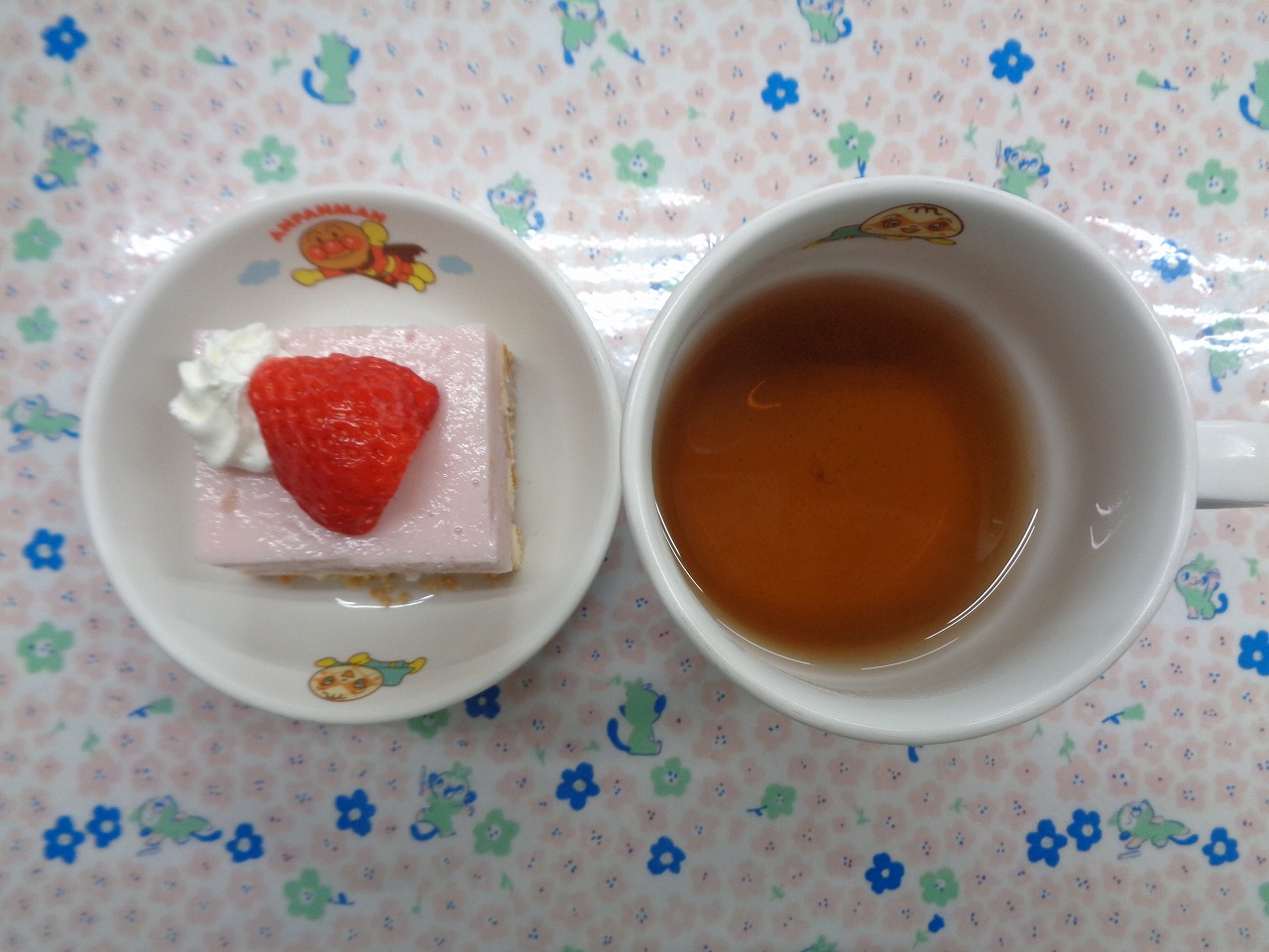 おやつは『ケーキ・麦茶』でした。今回のケーキは『いちごフルーチェタルト』ですハートたち (複数ハート)わーい (嬉しい顔)🍓