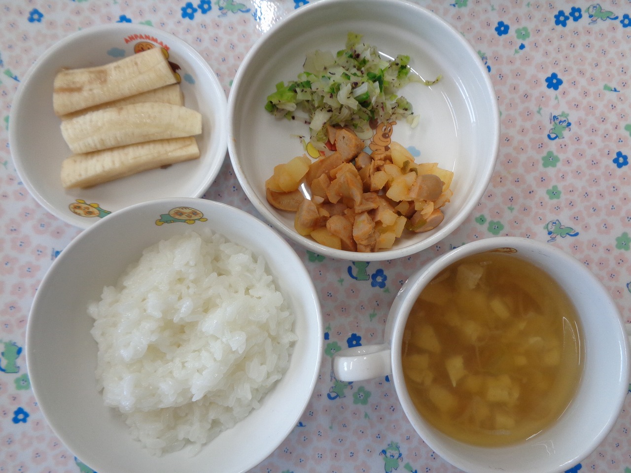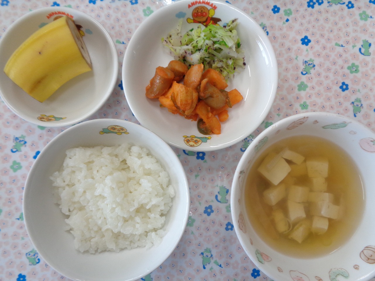27日の給食は『ウインナーの変わり味噌炒め・ゆかり和え・すまし汁(豆腐・焼き麩・葱)・バナナ』で、