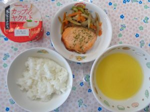 29日の給食は『鮭のムニエル・洋風きんぴら・コーンスープ・カップdeヤクルト』で、