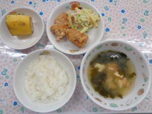 30日の給食は『鶏肉の唐揚げ・マカロニサラダ・みそ汁(玉葱・わかめ・厚揚げ)・バナナ』でしたバナナ