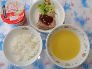1日の給食は『ミートローフ・キャベツサラダ・コーンスープ・カップdeヤクルト』で、