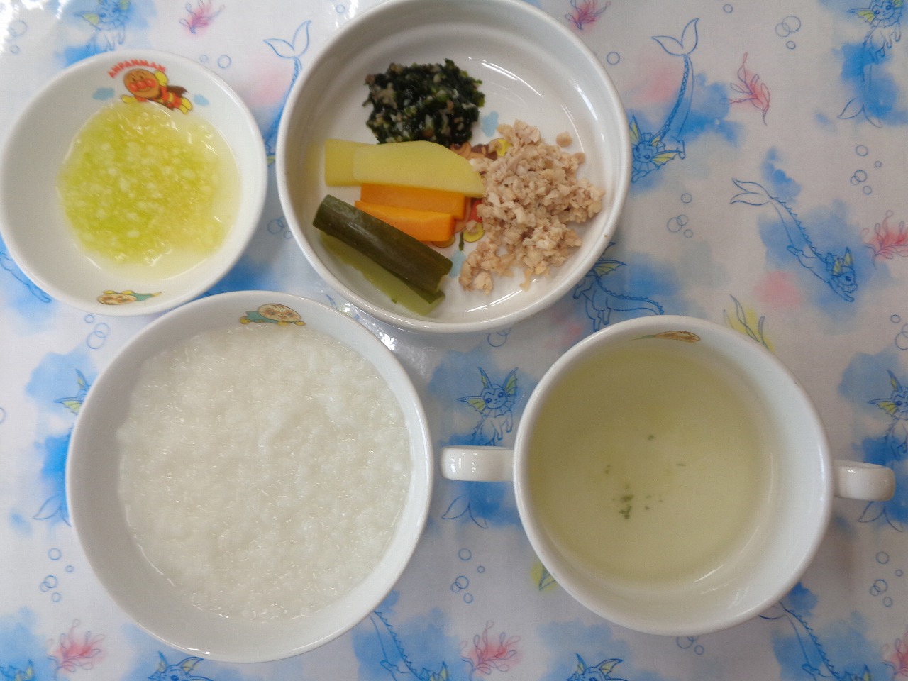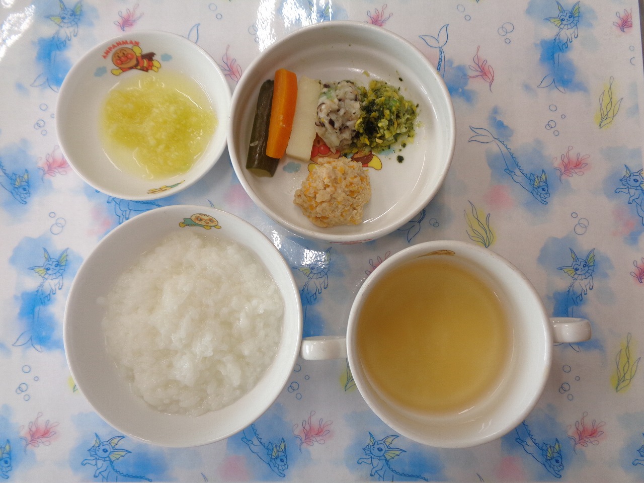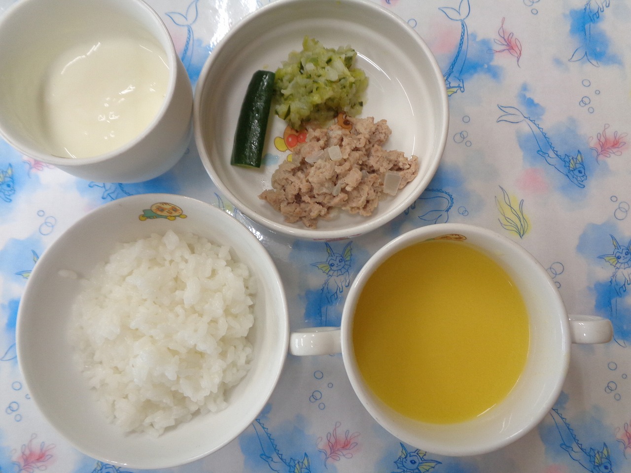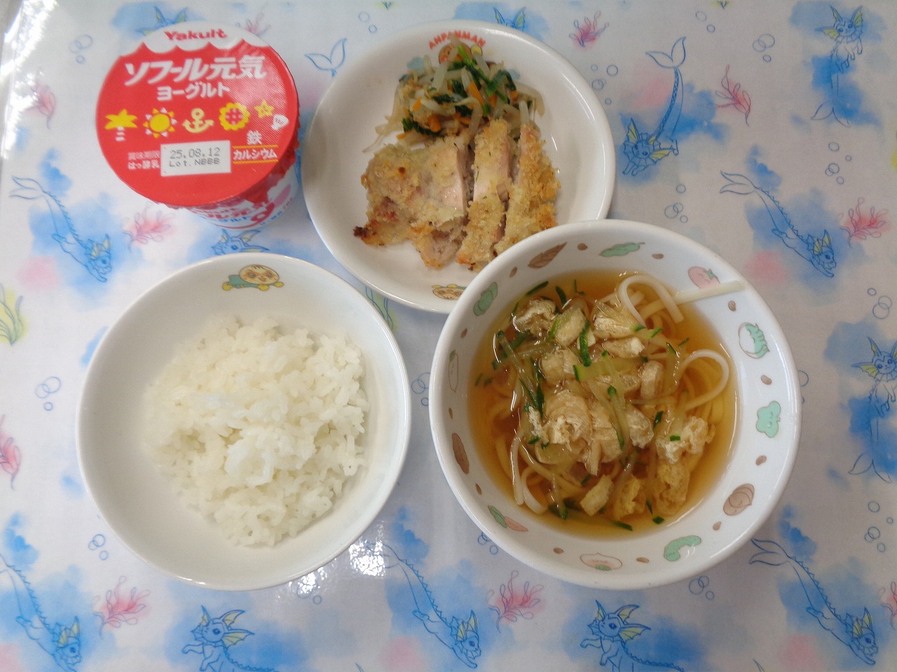 30日の給食は『ご飯・鶏肉のパン粉焼き・お浸し・冷やしうどん汁・ソフール』で、