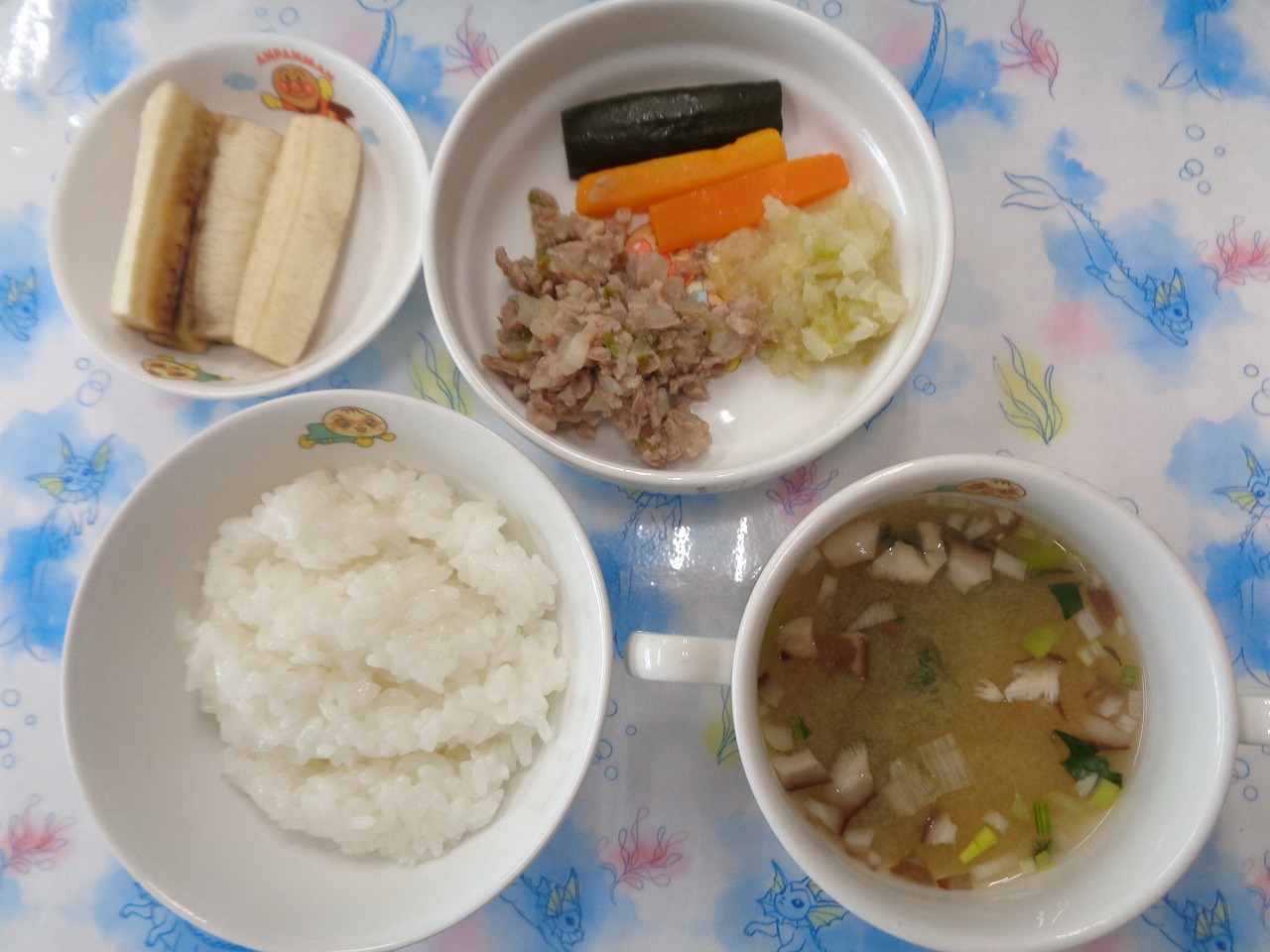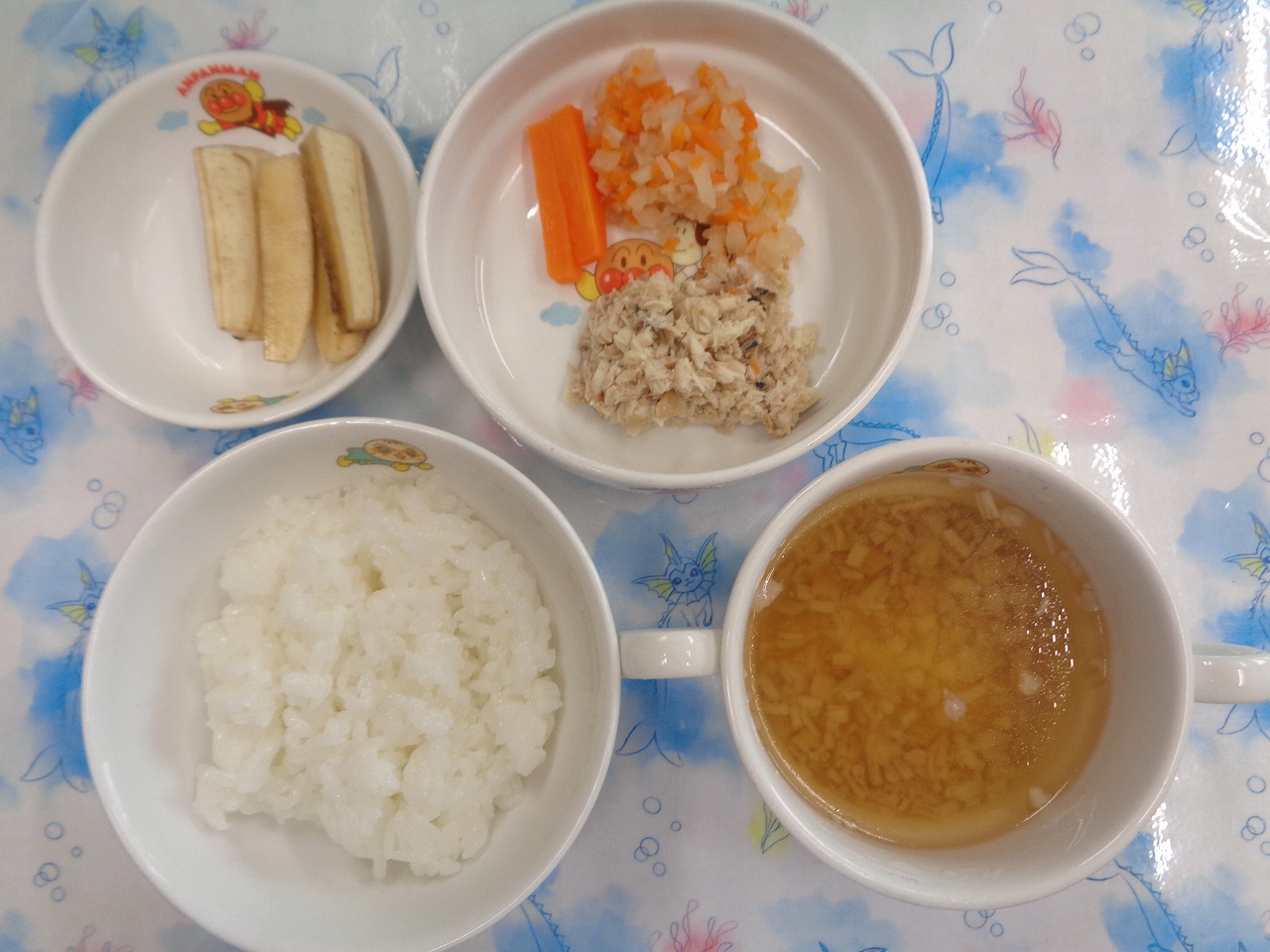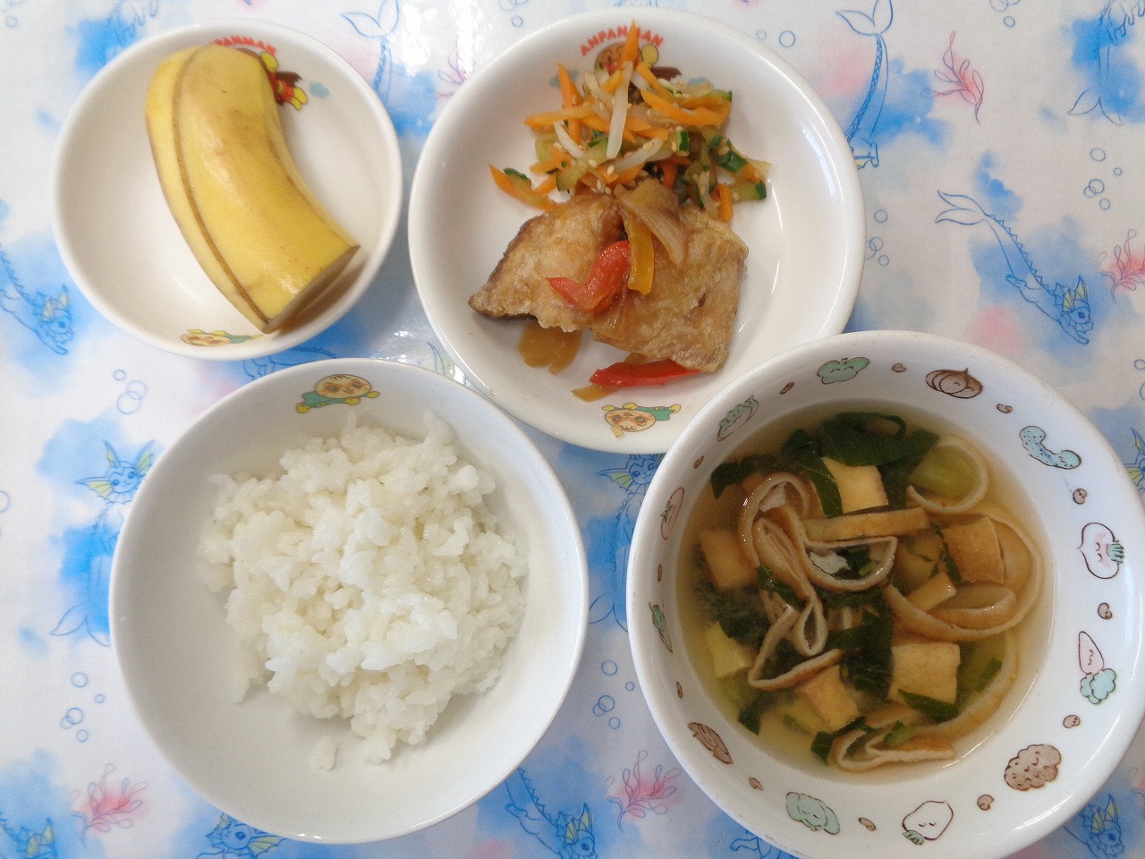 10日の給食は『赤魚の甘辛揚げ・麩入りお浸し・みそ汁(椎茸・わかめ・玉葱)・バナナ』で、