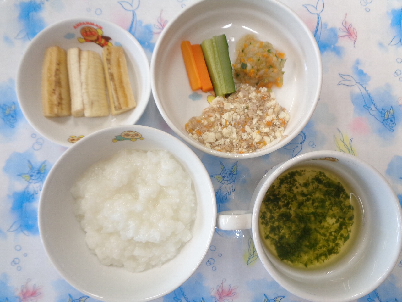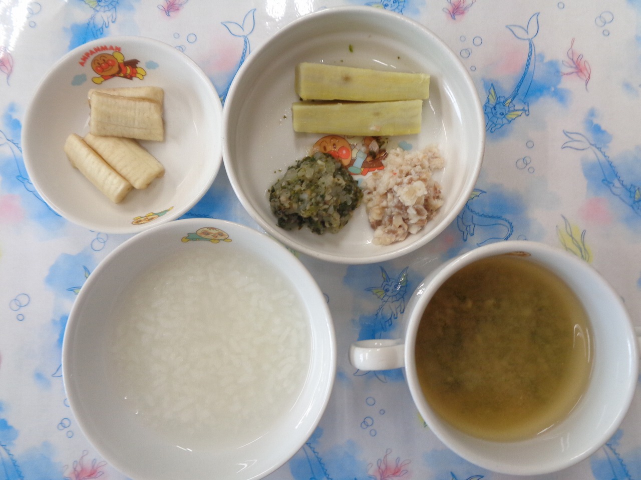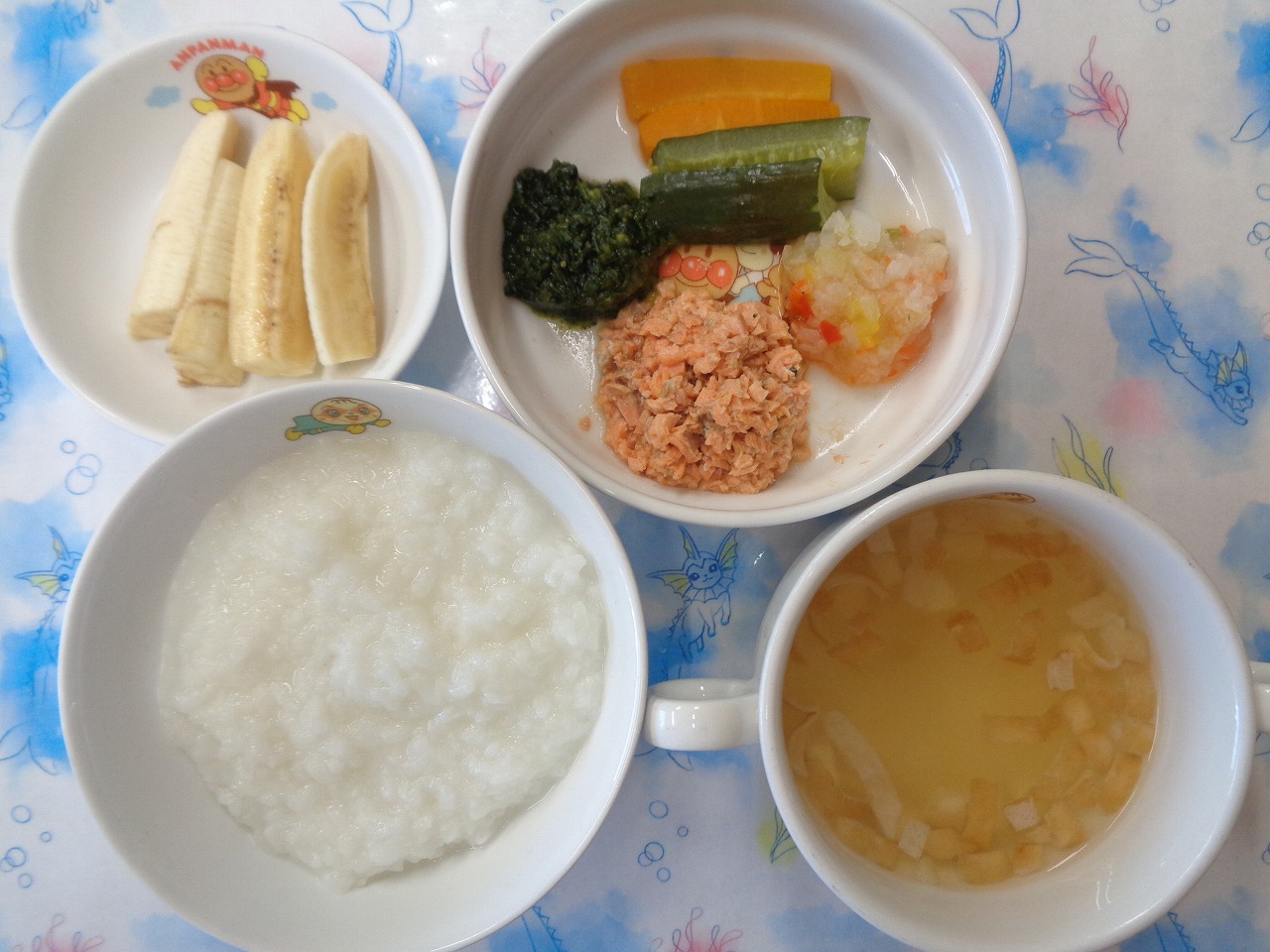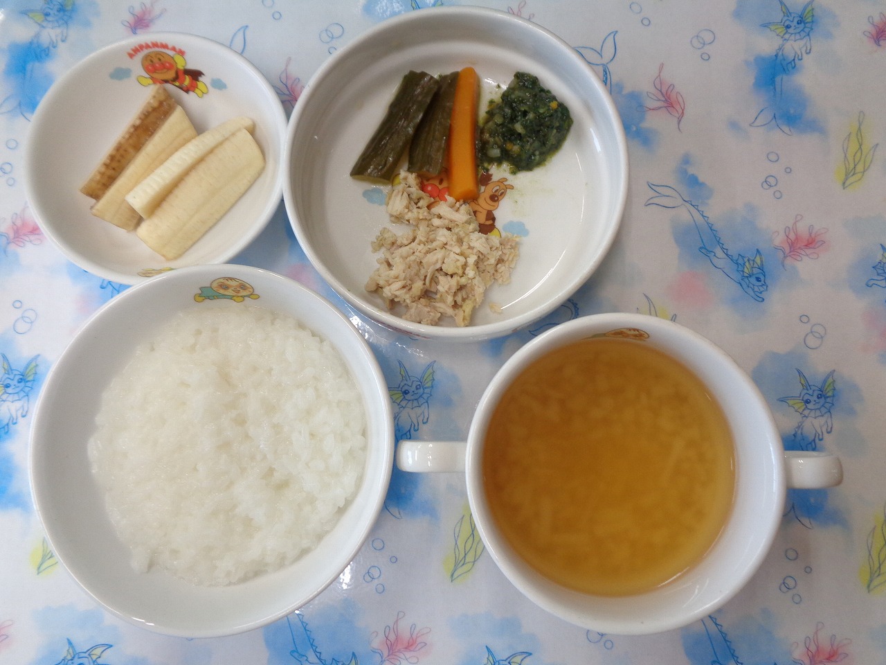 10日の給食は『赤魚の甘辛揚げ・麩入りお浸し・みそ汁(椎茸・わかめ・玉葱)・バナナ』で、