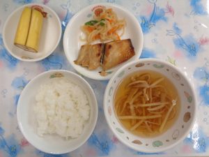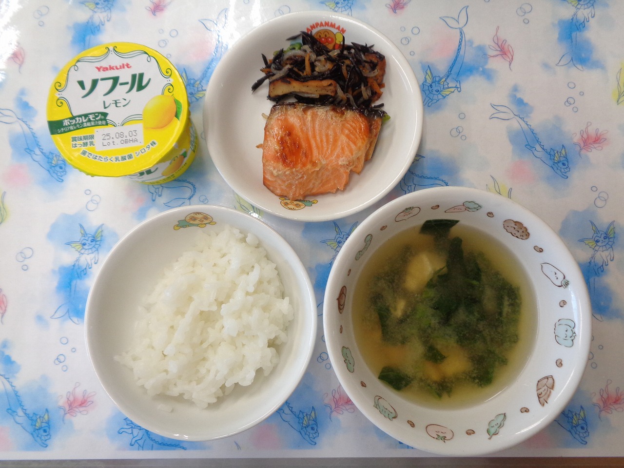 24日の給食は『焼き魚・ひじきの炒め煮・みそ汁(厚揚げ・小松菜)・ソフール』で、