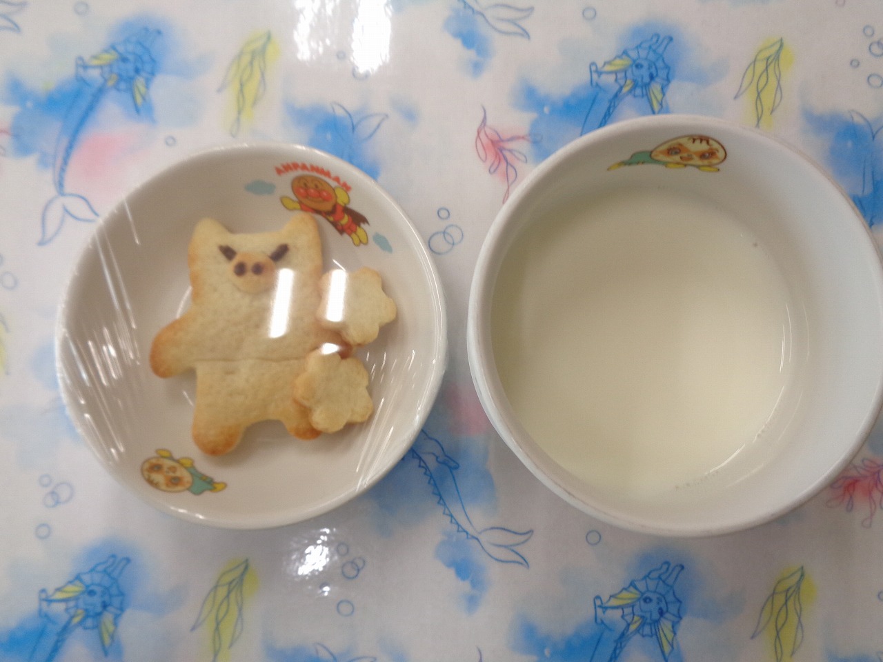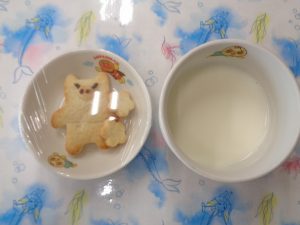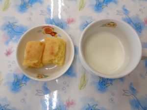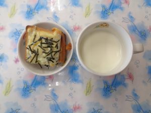 おやつは『こーんちーずちぢみ・牛乳』でした