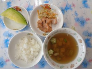 3日の給食は『鶏肉のマーマレード焼き・ごま和え・すまし汁(オクラ・豆腐・えのき)・メロン』で、