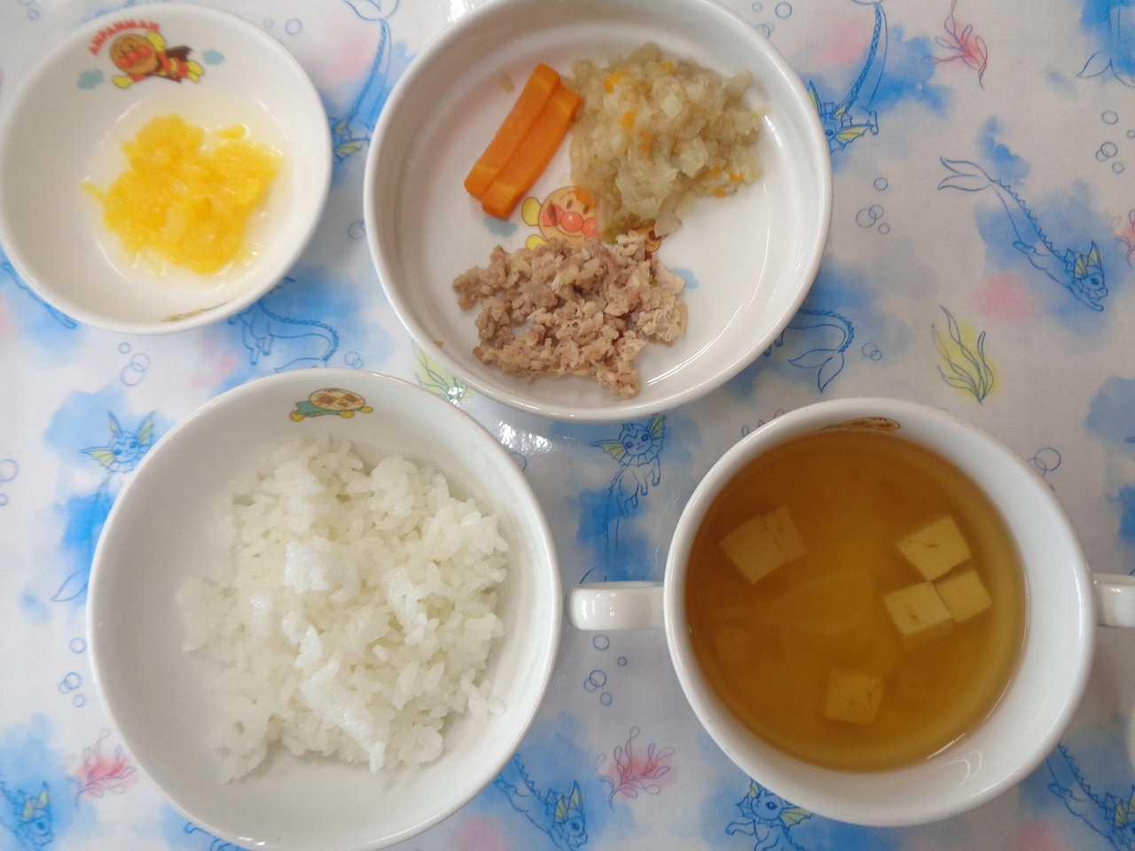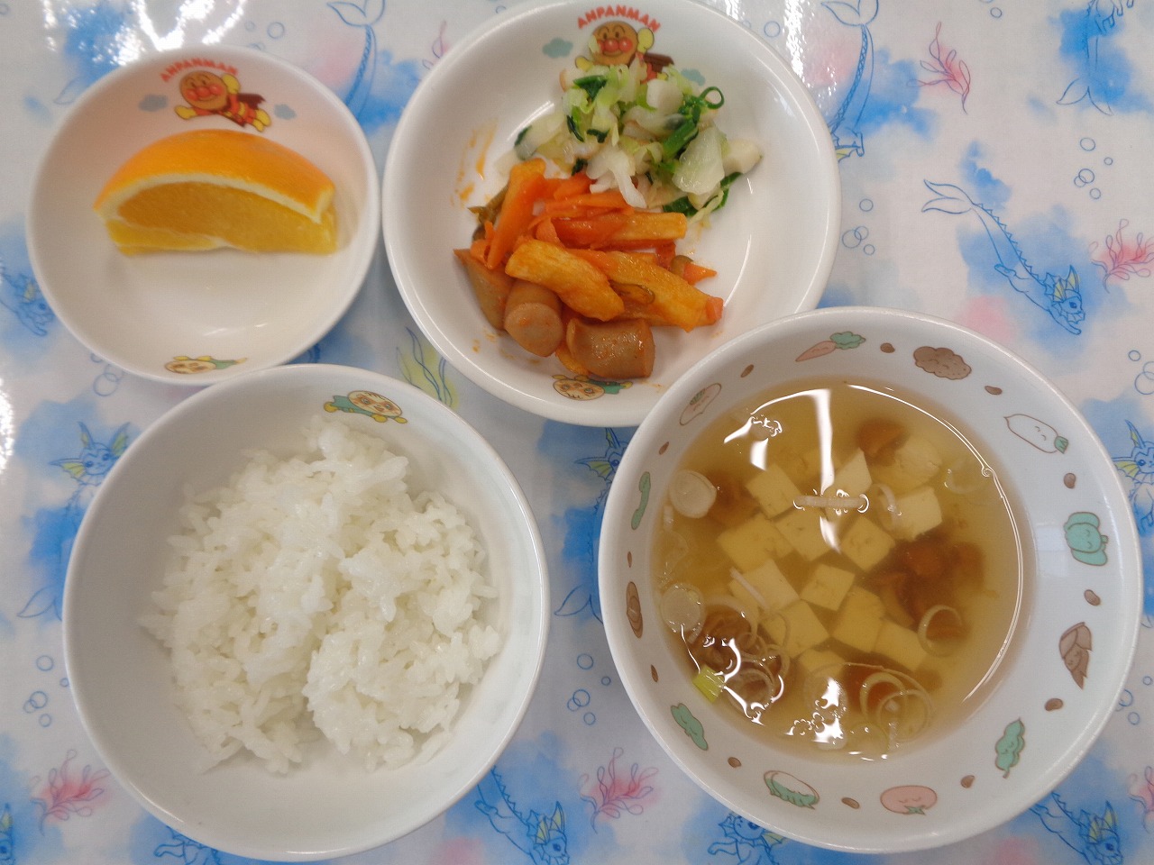 9日の給食は『ウインナーの変わり味噌炒め・しょうゆフレンチ・すまし汁(なめこ・豆腐・葱)・オレンジ』で、