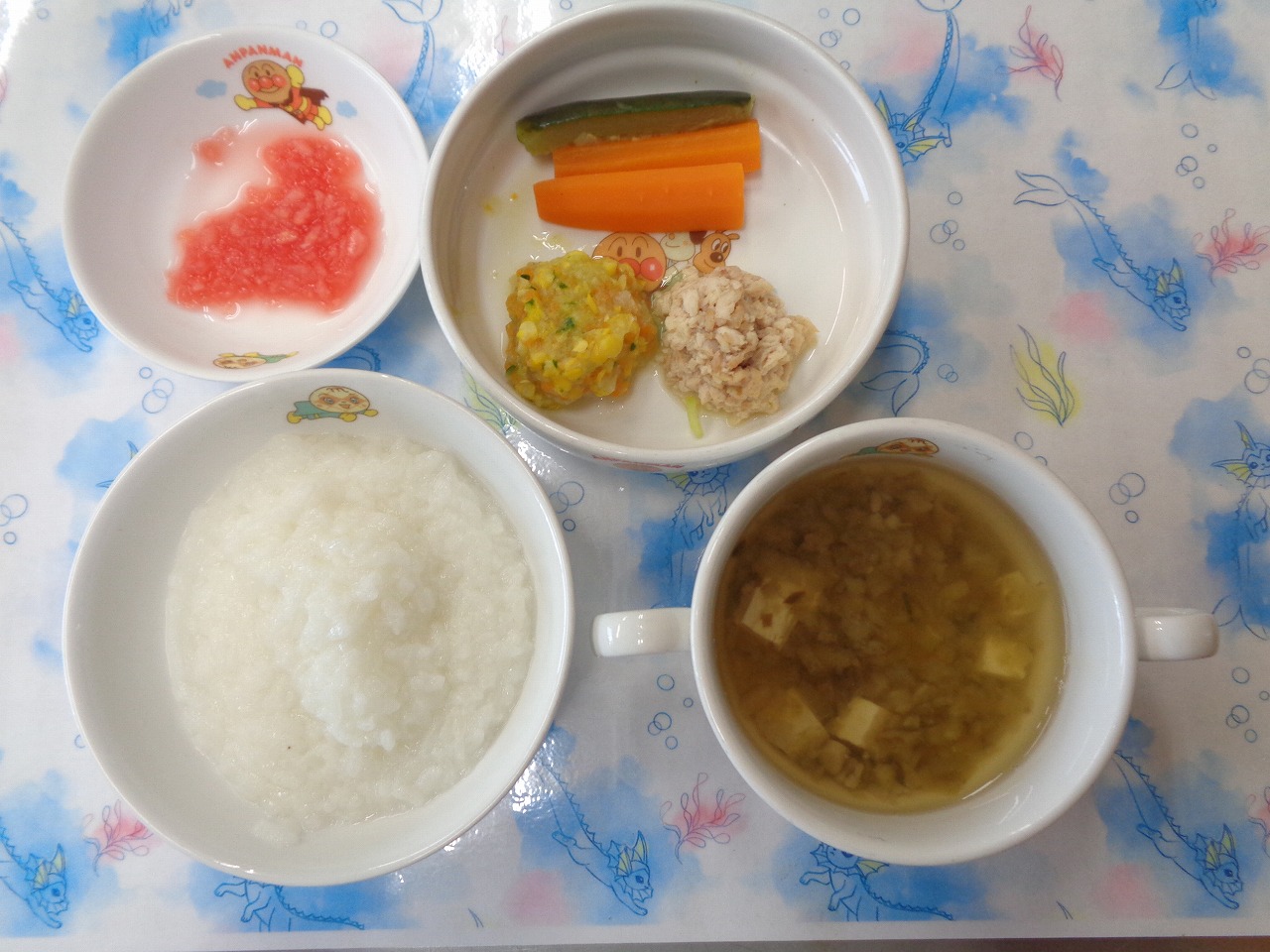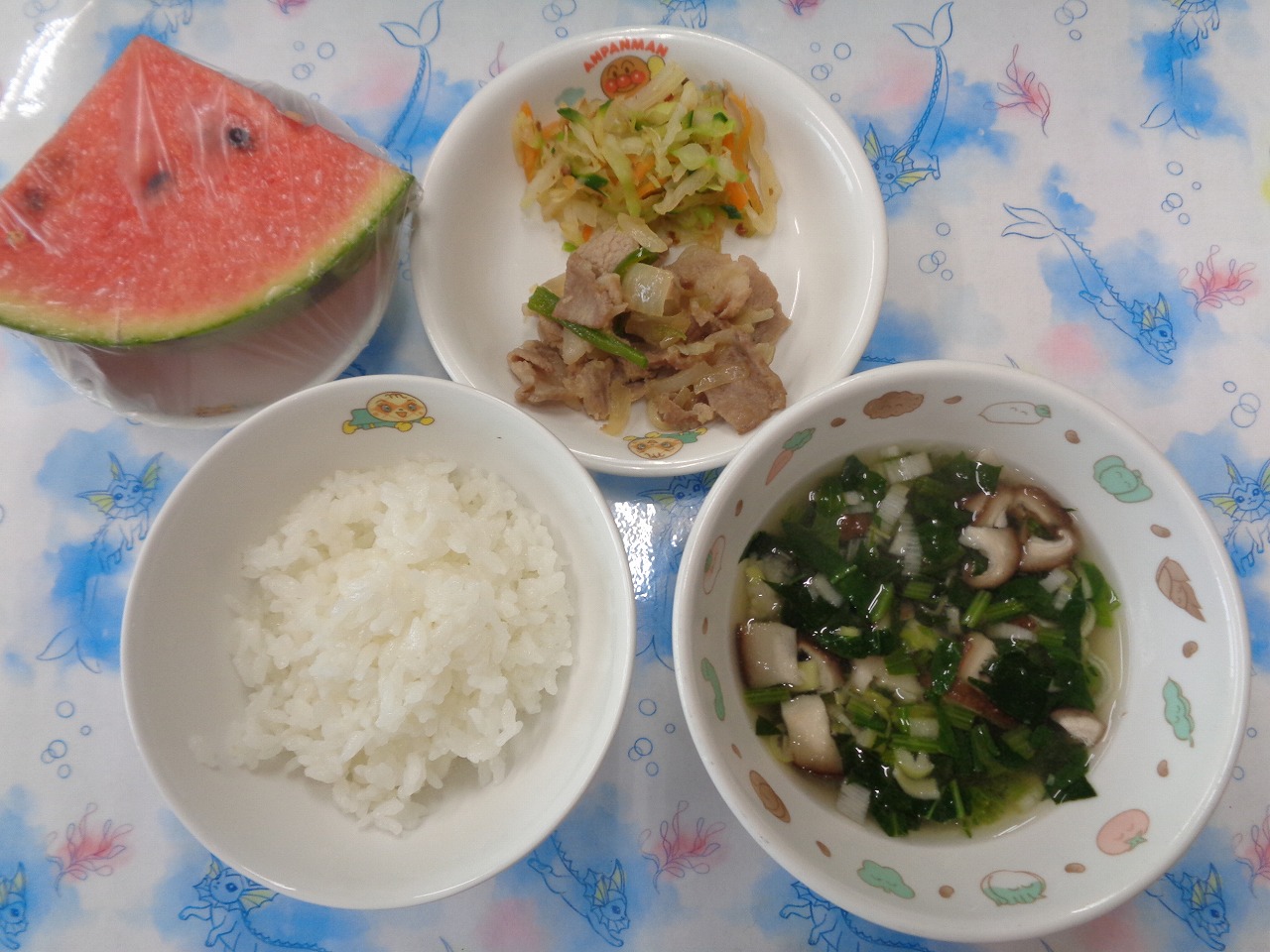 4日の給食は『豚肉の生姜焼き・おかか和え・みそ汁(ほうれん草・椎茸・葱)・スイカ』でした🍉