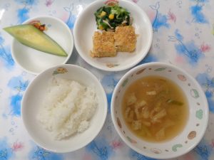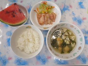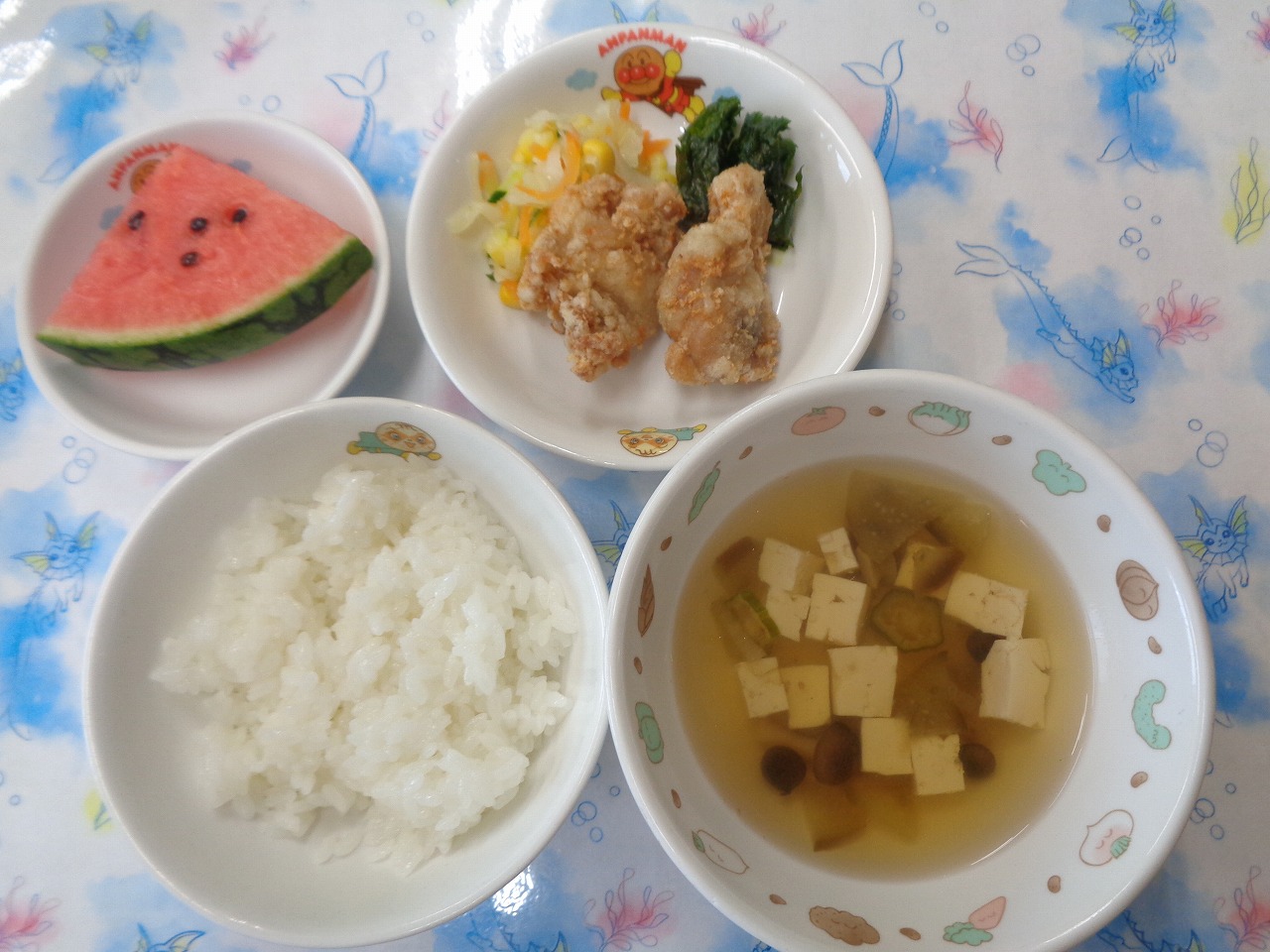 25日の給食は『鶏肉の塩唐揚げ・コーンサラダ・すまし汁(ナス・豆腐・しめじ・オクラ)・スイカ』でした🍉