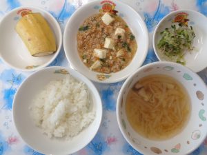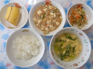14日の給食は『麻婆豆腐・もやしのナムル・卵スープ・バナナ』でした