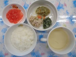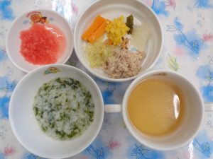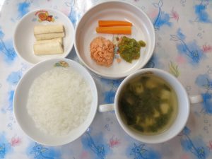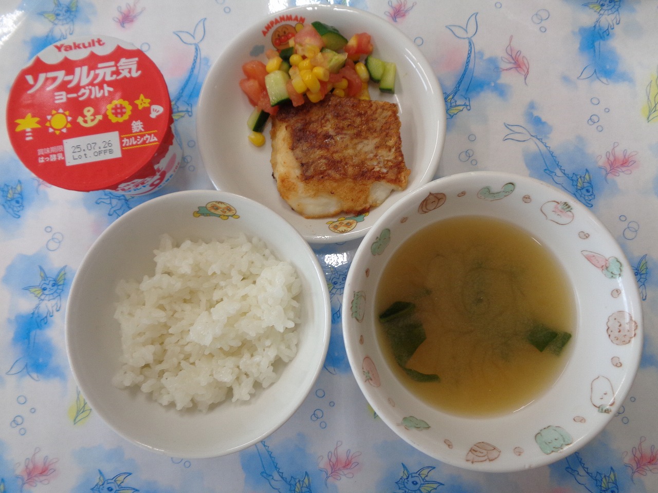 15日の給食は『まだいのムニエル・三色サラダ・みそ汁(ほうれん草・玉葱)・ソフール』で、