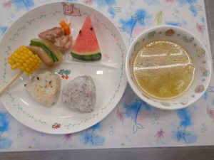16日の給食は『おにぎり・ミニバーベキュー串・野菜スープ・スイカ』で、