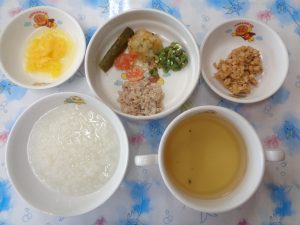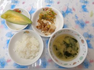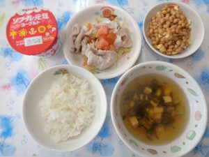 18日の給食は『冷しゃぶごまだれ・チーズ納豆・すまし汁(ナス・豆腐・小松菜)・ゼリー』でした