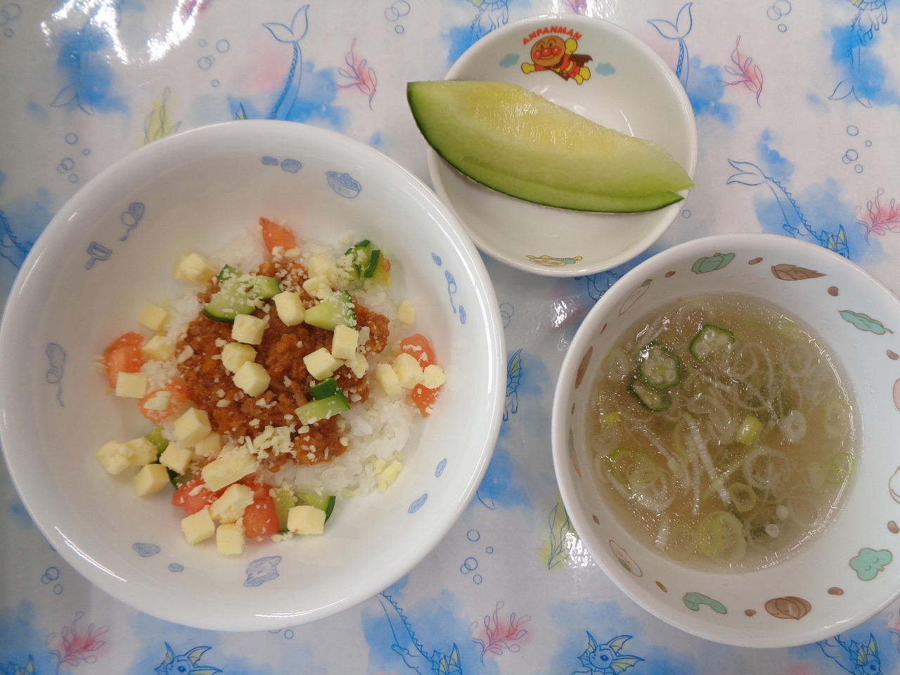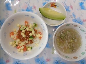 23日の給食は『タコライス・オクラスープ・メロン』で、