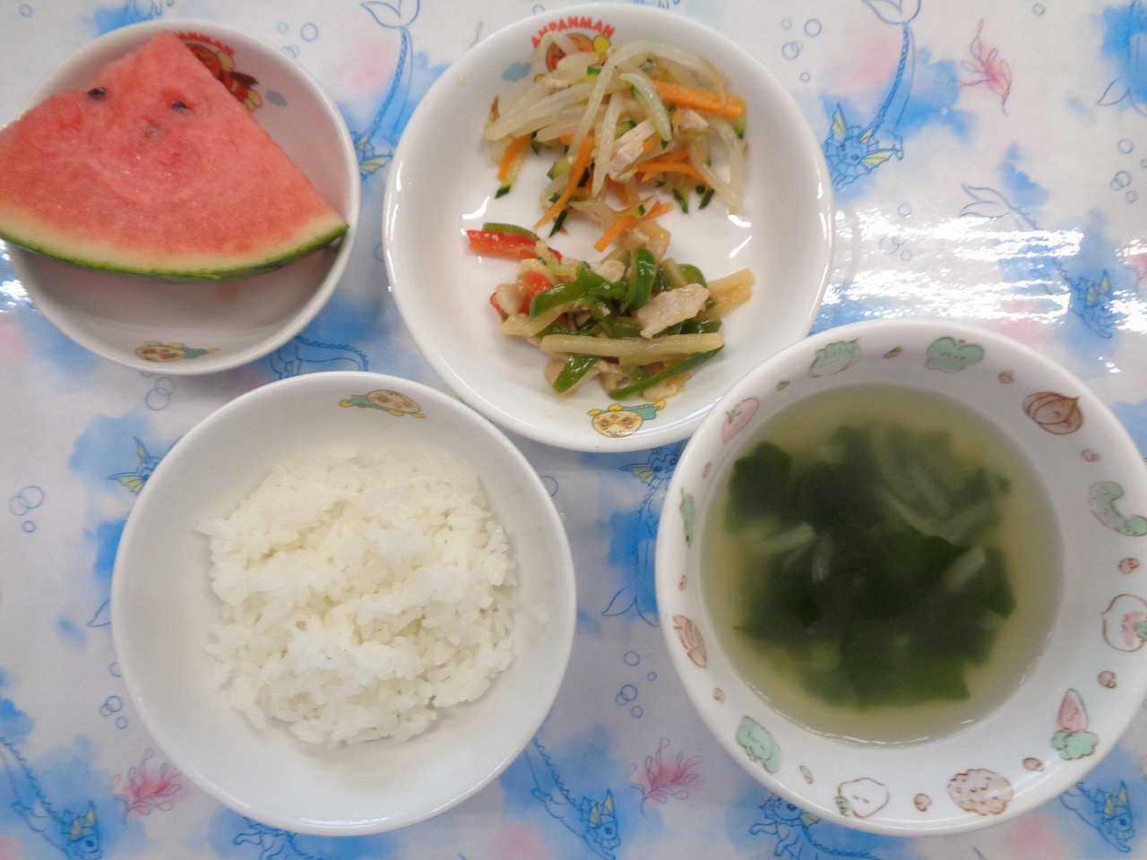 31日の給食は『チンジャオロース・華風和え・わかめスープ・スイカ』で、